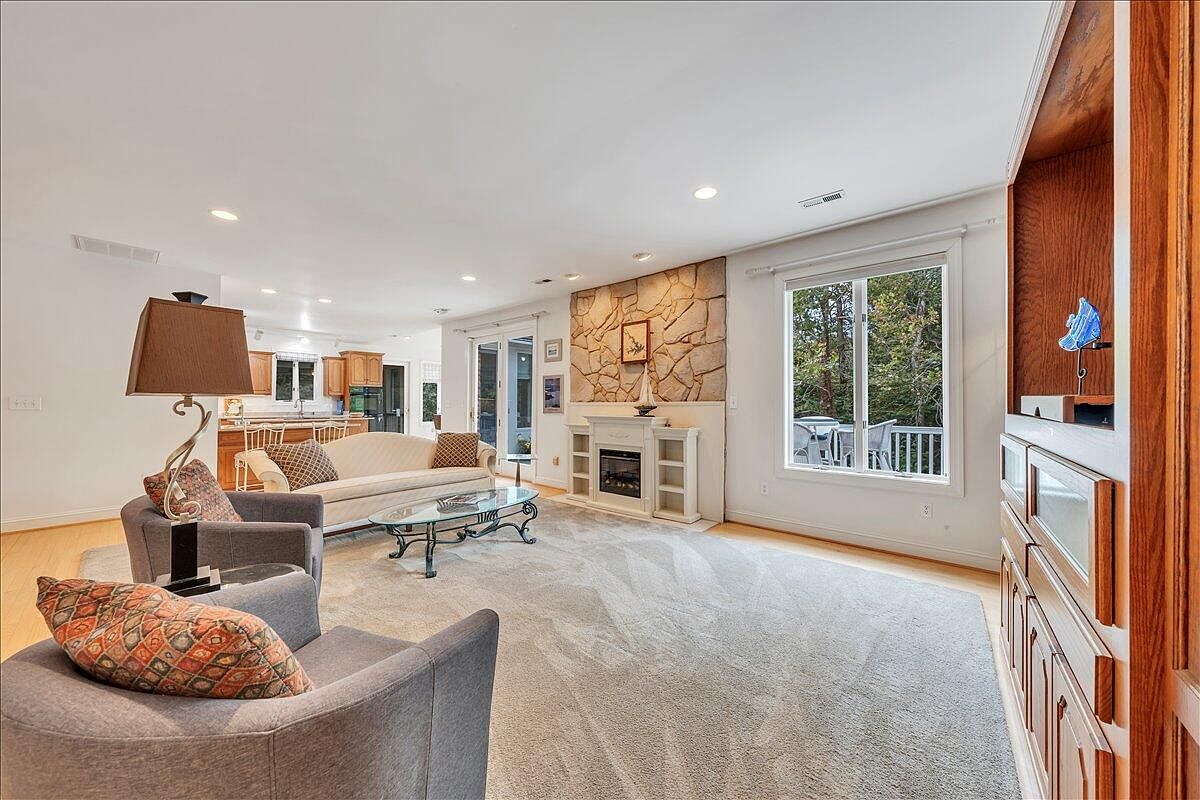 This inviting living room features a cozy arrangement with a light color palette. A plush, neutral-toned sofa and two accented armchairs create a welcoming atmosphere. The glass coffee table, supported by an ornate metal base, adds elegance. A prominent feature is the stone fireplace, which enhances warmth and character, flanked by a stone wall that harmonizes with the room’s natural light from large windows. Wooden cabinetry provides storage and accents the softer tones. The overall layout promotes an open feel, seamlessly connecting to the dining area, while a soft, textured carpet underfoot adds comfort.