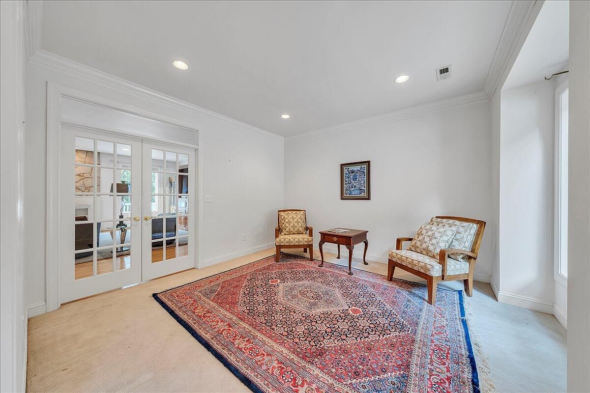 A cozy sitting room features a light neutral wall color that enhances the natural light filtering in. At the center, an ornate Persian rug adds warmth and color, with intricate patterns of reds, blues, and ivory. Two vintage armchairs with patterned upholstery complement the rug, positioned around a small wooden side table that exhibits classic design. The room showcases elegant crown molding along the ceiling. Light fixtures recessed into the ceiling provide soft illumination. Glass-paneled double doors lead to another space, inviting an open feel while maintaining privacy.