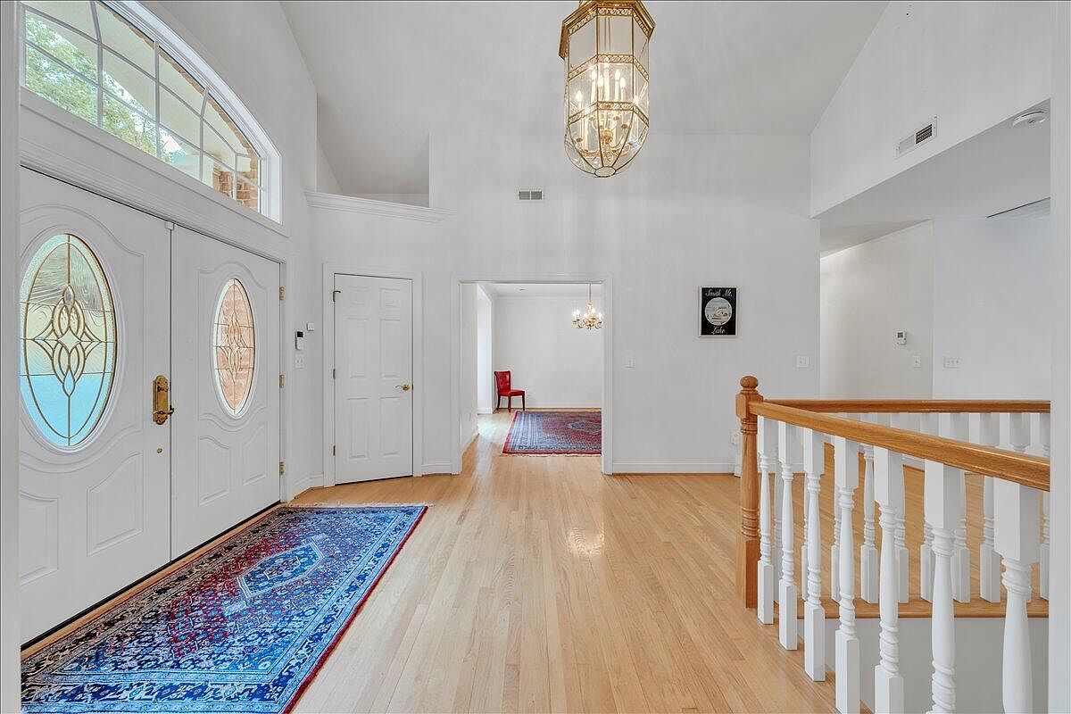 The entryway features a spacious layout, illuminated by natural light streaming through large double doors and sidelights. The elegant chandelier adds sophistication, while the high ceiling enhances the airy feel. Rich wood flooring is complemented by an ornate blue and red area rug, creating a welcoming atmosphere. To the left, a simple white door leads to a closet, and ahead, an archway opens to another room adorned with a golden chandelier. Soft, neutral wall colors maintain an understated elegance, with a decorative wall plaque adding a personal touch to the space.