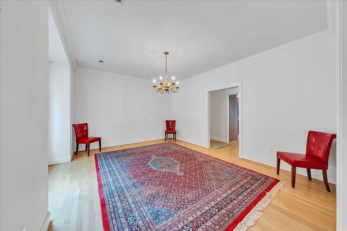 This living room features a warm, inviting layout with natural light pouring in from the windows. The hardwood floor complements the vibrant, intricately patterned Persian rug that anchors the space. Two striking red chairs sit elegantly on either side of the room, adding a pop of color. A vintage chandelier hangs from the ceiling, its design exuding classic sophistication. The walls are painted a crisp white, creating a bright contrast with the rich rug and furniture. An open doorway suggests a connection to adjoining rooms, enhancing the openness of the space.