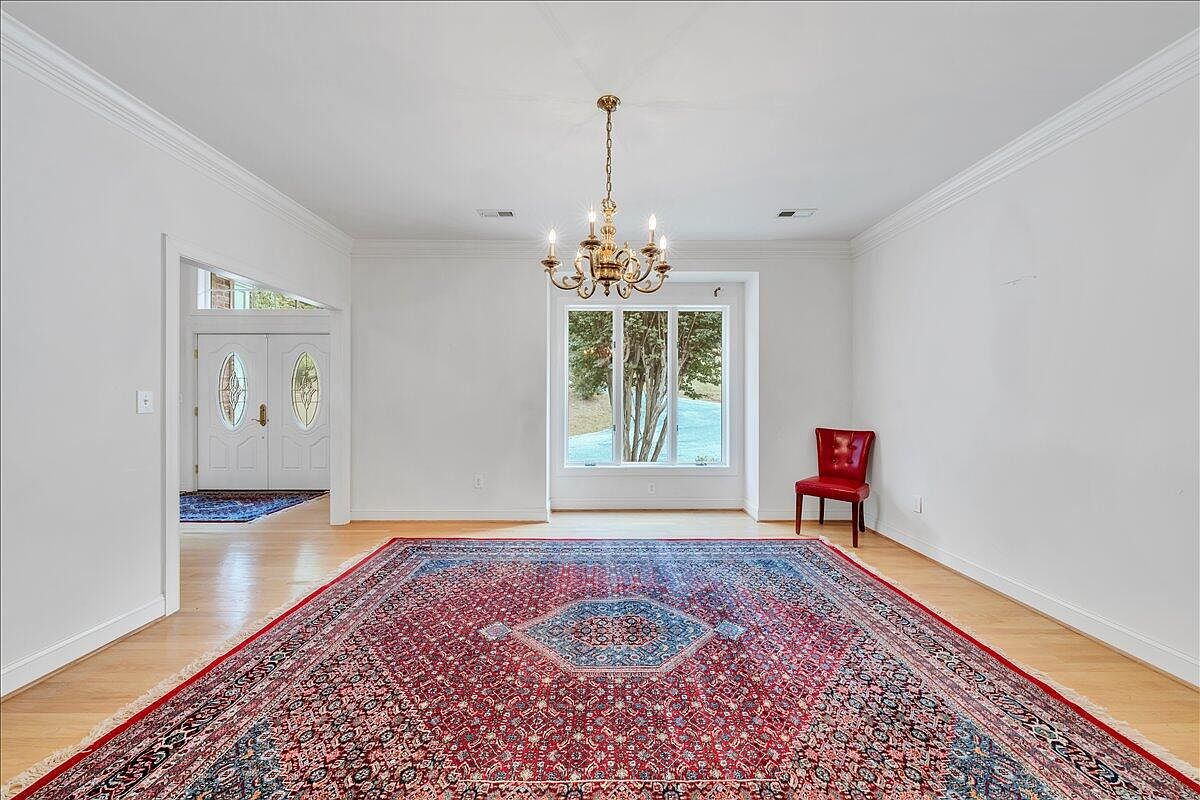 This entry hall features a spacious layout with light-colored walls and hardwood flooring that enhances the room’s brightness. A striking chandelier hangs from the ceiling, casting a warm glow. A large, intricate Persian rug in rich reds and blues adds a touch of elegance and comfort, anchoring the space. A single, vibrant red chair offers a pop of color against the neutral backdrop, creating an inviting focal point. To one side, double doors with decorative glass invite natural light, while large windows reveal glimpses of the outdoor landscape, beautifully integrating indoor and outdoor elements.