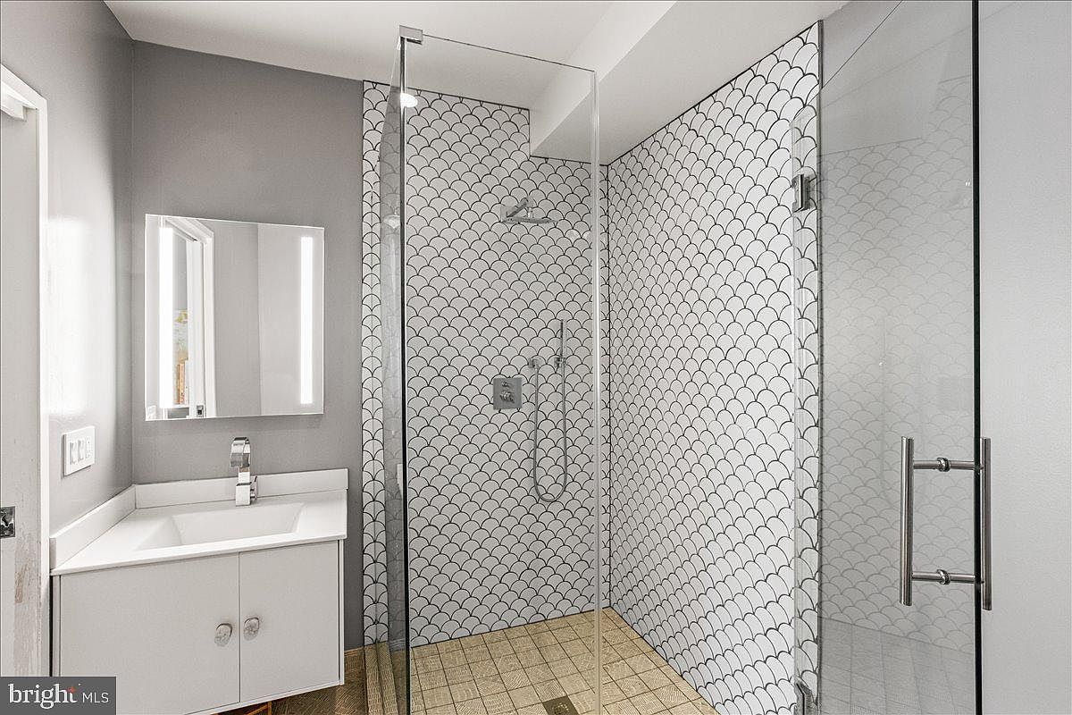 The modern bathroom features a spacious, glass-enclosed shower with a unique scallop-patterned tile backdrop, adding an artistic flair. The walls are coated in a light gray hue, creating a serene ambiance. A sleek, white vanity with a clean-lined design complements the space, outfitted with a single, contemporary sink and polished chrome faucet. Above the vanity, a rectangular mirror is illuminated by vertical LED strips, enhancing the modern aesthetic. The floor has a textured, light beige tile that juxtaposes the smooth surfaces above. Overall, the design blends minimalism with elegance, ensuring functionality and style.