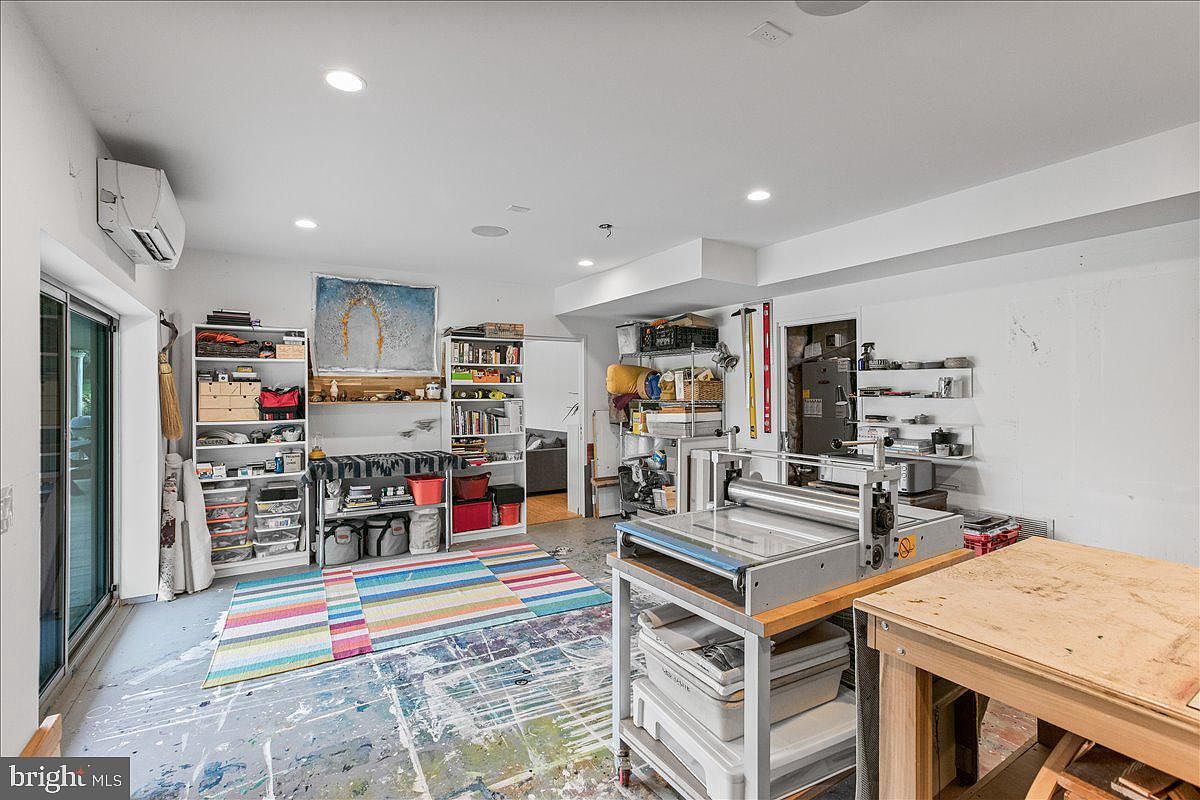 This vibrant art studio features an open layout with ample natural light streaming in through sliding glass doors. The walls are painted white, enhancing the brightness of the space. A colorful striped rug spans the floor, contrasting with the splashes of paint on the concrete beneath. Shelving units filled with art supplies, canvases, and books are organized around the room. In the center, a sturdy work table with metal legs and wooden top is set up, alongside a printing press, indicating creative activities. The room combines functionality and artistic flair, ideal for a painter or craftsman.