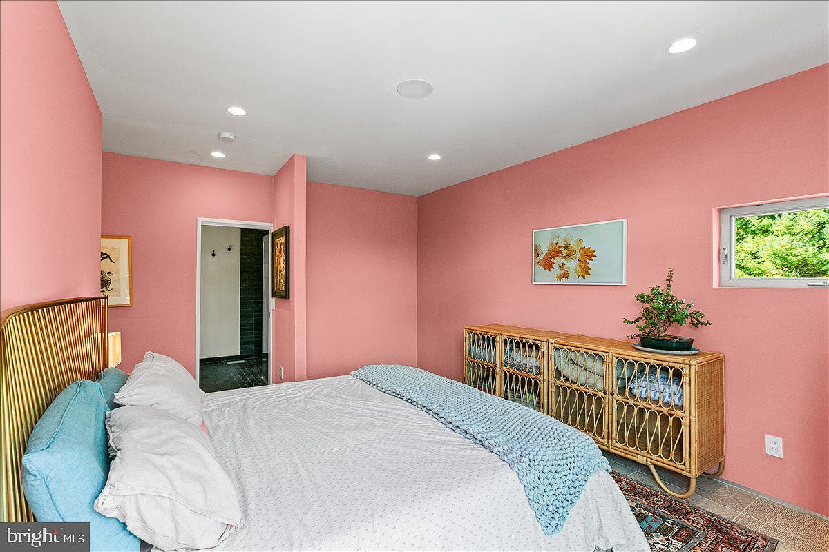 The bedroom features vibrant pink walls, creating a warm and inviting atmosphere. A large bed is adorned with soft, white bedding accompanied by a textured blue throw blanket. To the side, a stylish rattan console adds a touch of natural elegance, filled with neatly displayed textiles. Above the console, a framed artwork of foliage introduces a hint of artistry, complemented by a small potted plant that enhances the organic feel. The room is illuminated by recessed ceiling lights, ensuring a bright yet cozy environment, while a small window offers a glimpse of greenery outside, connecting the interior to nature.