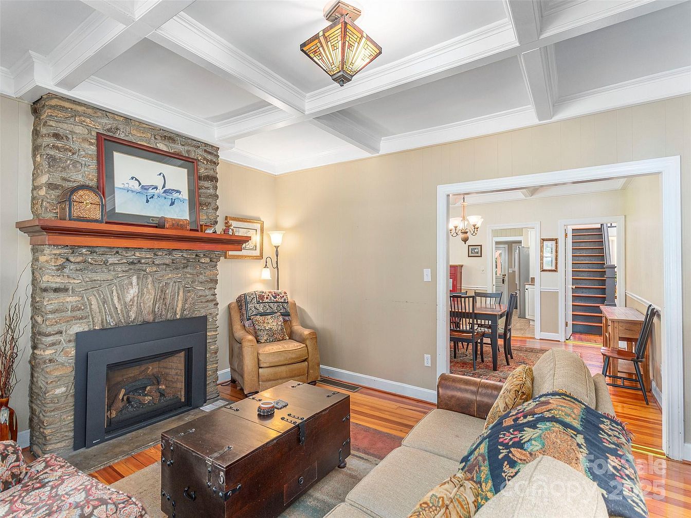 A cozy, inviting living room with a prominent stone fireplace, topped by a wooden mantel holding a framed painting of ducks and other decorative items. The room features coffered white ceilings that add architectural interest and beige walls for warmth. There is a light brown armchair near the fireplace and a patterned upholstered armchair in the foreground, both complemented by plush cushions and a colorful throw. A dark wood chest serves as a coffee table on an earth-toned rug. Warm, natural wood floors extend into the adjacent dining area, which is visible through a large open doorway, leading towards a staircase and kitchen area. The lighting includes a geometric pendant on the ceiling and a tall standing lamp beside the armchair.