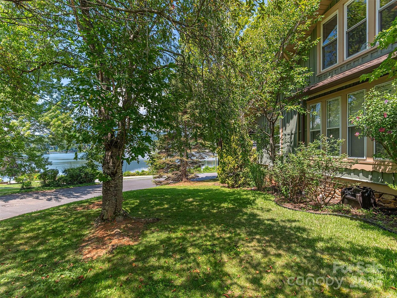 Tall, leafy trees cast dappled shade over a lush green lawn, creating a serene and inviting atmosphere. The house, partially visible to the right, features earth-toned siding with large, multi-pane windows bordered by beige trim. Well-maintained shrubbery, including flowering bushes, lines the home’s foundation. In the background, a paved driveway curves gently toward a calm, sparkling lake bordered by more trees and greenery. The overall aesthetic blends natural beauty with classic residential charm, enhanced by the proximity to the water and the mature landscaping that provides privacy and a peaceful setting.