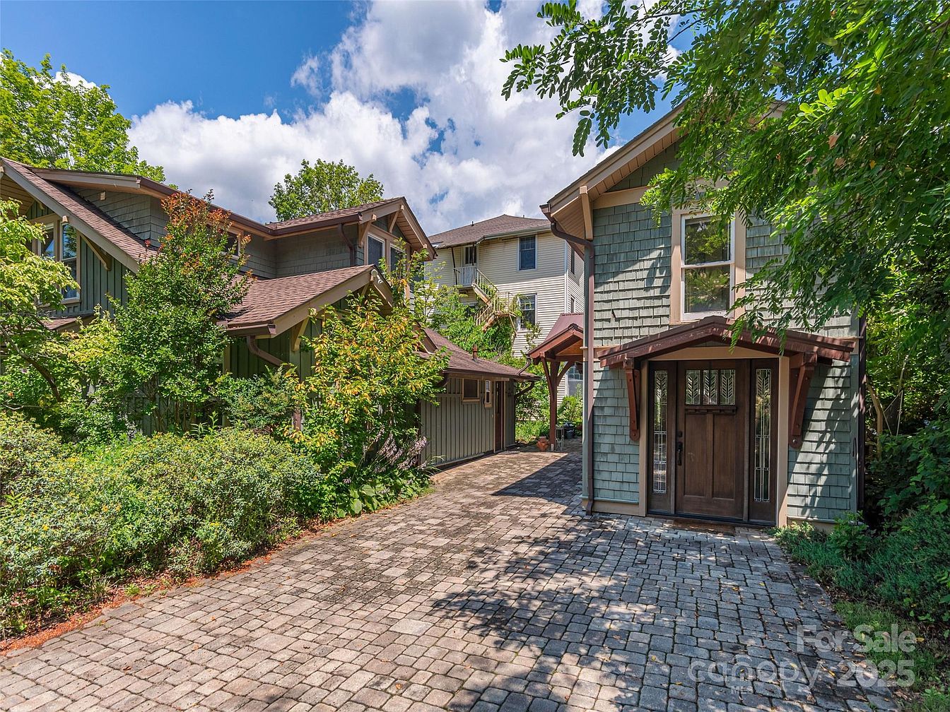 The entryway showcases a charming Craftsman-style exterior, featuring sage-green wooden shingles and siding highlighted by natural wood trim. A cobblestone driveway in varying gray tones leads to the front door, which is framed by decorative supports and glass side panels for added light. Lush landscaping surrounds the approach, with mature trees and bushes contributing to a private, serene ambiance. The multi-gabled rooflines, overhanging eaves, and soft natural colors create a welcoming, rustic vibe that blends harmoniously with the garden elements and the bright blue sky overhead.