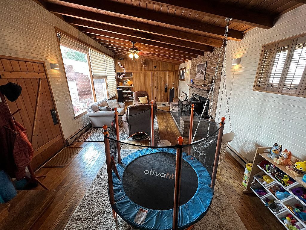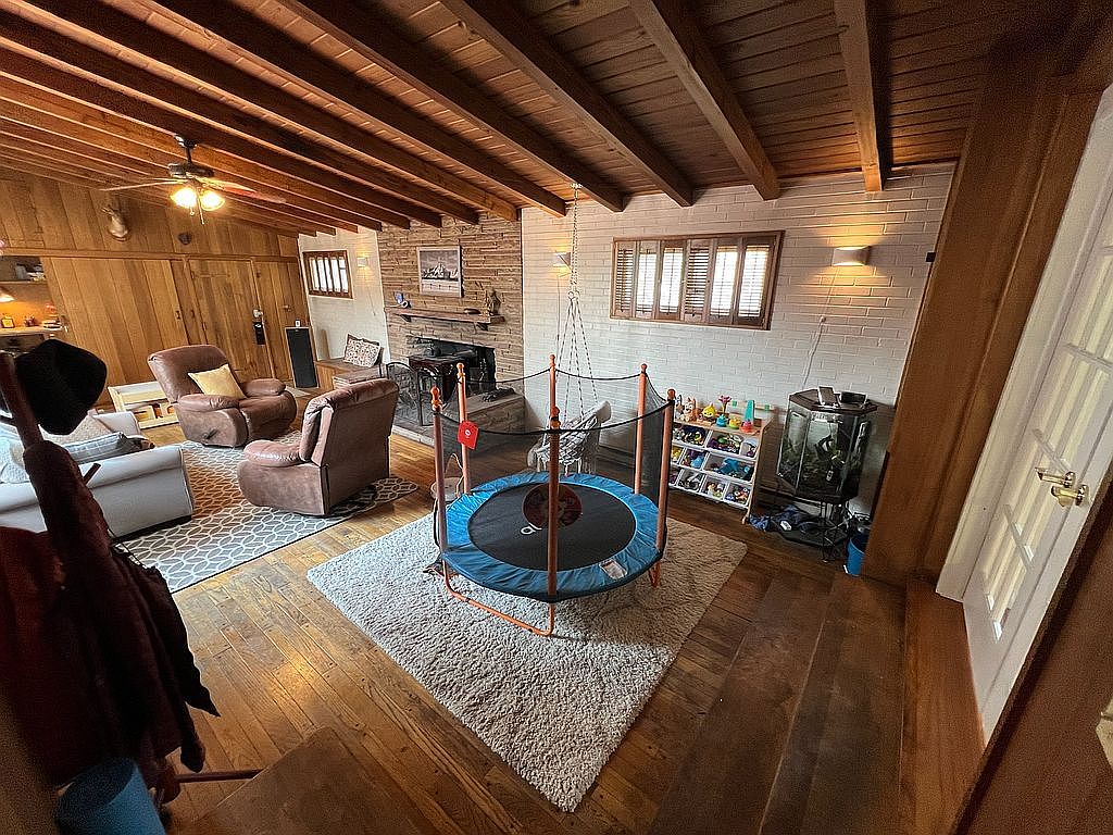 A spacious family room featuring wooden beams across the ceiling, enhancing the rustic charm. Light colored brick walls provide a warm backdrop, while large windows invite natural light, showcasing adjacent outdoor seating. A cozy area rug delineates a lounging zone with a sectional couch adorned with colorful cushions. An at-home activity trampoline occupies the center, surrounded by mesh for safety. A stone fireplace serves as a focal point against one wall, adorned with personal decorations. On the right, a low shelf displays vibrant toys, adding a playful touch. Flooring is polished wood, contributing to the inviting atmosphere.