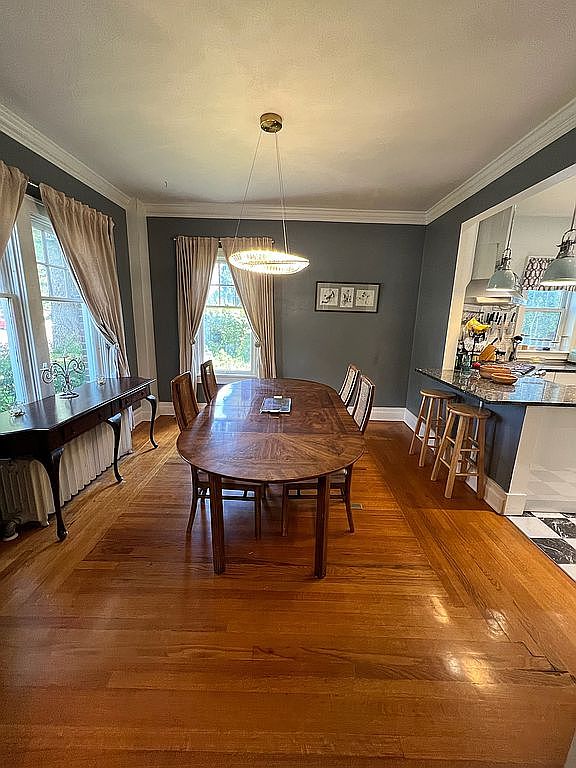 A warm, inviting dining room featuring a polished wooden table surrounded by six chairs. The walls are painted in a muted gray, harmonizing with the rich wood tones. Natural light floods in through large windows, dressed with elegant curtains that cascade to the floor. A modern pendant light hangs elegantly above the table, providing a focal point. To the side, a dark wood console adds sophistication, while a glimpse of the kitchen reveals light-colored cabinetry. The hardwood floor showcases a rich grain beneath the table, completing the cohesive aesthetic of traditional and contemporary design.