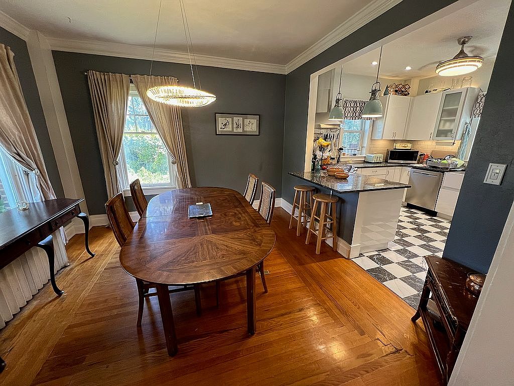 This dining room features a large, polished wooden table surrounded by elegantly designed chairs, exuding classic charm. The dark gray walls provide a sophisticated contrast to the warm, honey-colored hardwood floor. Natural light streams in through large windows dressed in soft, flowing curtains, enhancing the inviting atmosphere. A stylish chandelier hangs above the table, adding a modern touch. To one side, a sleek wooden sideboard complements the space, while an open passage leads into a contemporary kitchen with a contrasting black and white checkered floor. The blend of vintage and modern aesthetics creates a harmonious and inviting dining space.