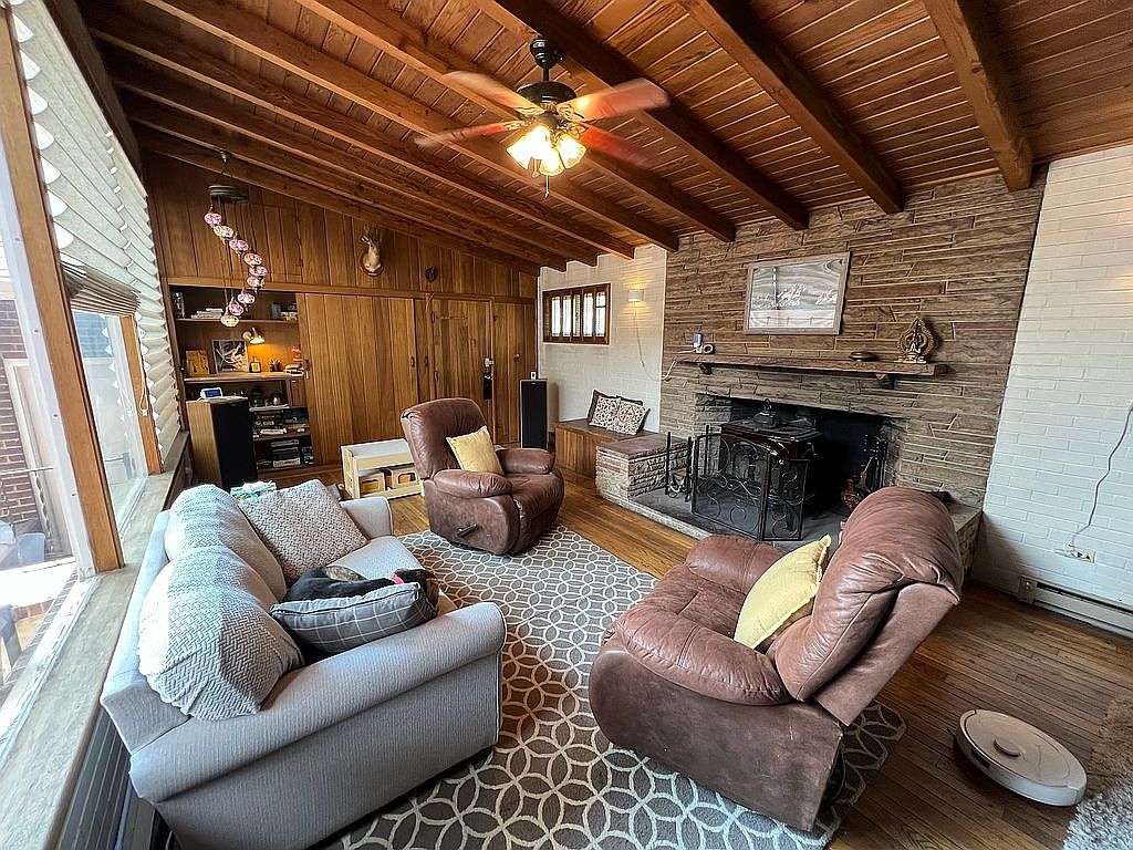 This vibrant living room features a striking contrast of textures and colors. The sloped wooden ceiling enhances the sense of space, with exposed beams adding rustic charm. A stone accent wall houses a classic fireplace, creating a cozy focal point. Plush seating includes a gray sofa adorned with patterned pillows and two brown recliners, inviting relaxation. A geometric area rug grounds the room, complementing the warm wooden floors. Natural light floods through expansive windows, softened by tasteful blinds. Decorative shelves display personal items, enhancing the home’s warmth and personality, while a ceiling fan adds comfort.