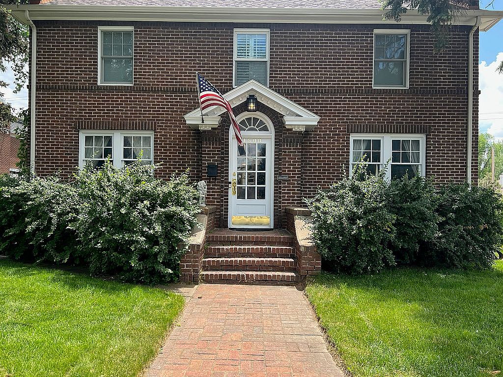 The front entrance showcases a charming traditional design, featuring a symmetrical façade of red brick. A set of wide stone steps leads to a glass-paned front door flanked by sidelights, enhancing natural light. Above the door, a decorative architrave adds architectural interest, complemented by a classic lantern. Two large, white-framed windows sit on either side of the entrance, reflecting a balanced aesthetic. Lush green shrubs frame the doorway, while a vibrant American flag adds a patriotic touch. The manicured lawn presents a rich green contrast to the warm brick tones, creating a welcoming atmosphere.
