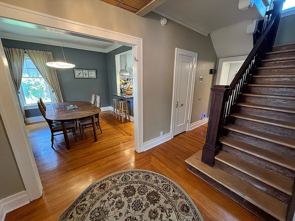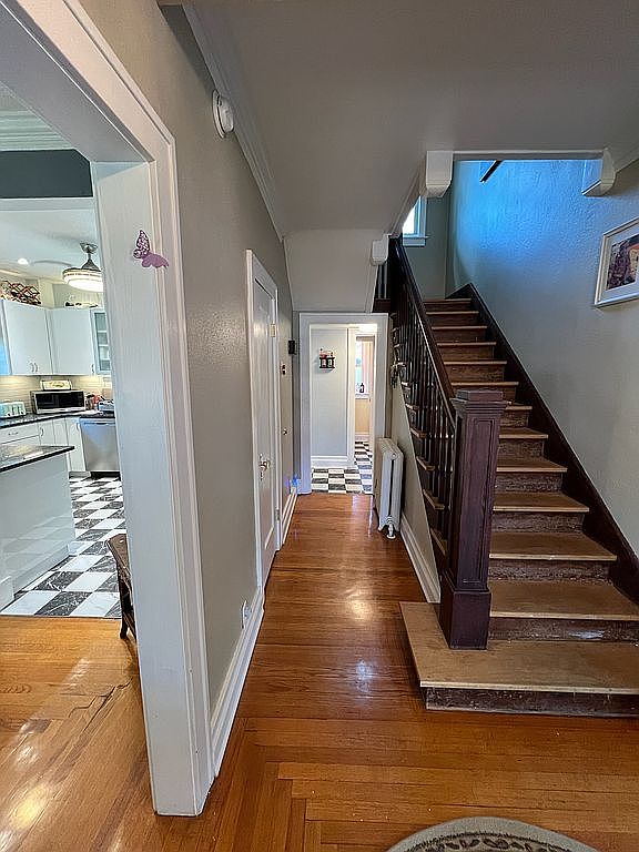 A bright, welcoming hallway showcases rich hardwood flooring that contrasts with the muted gray walls. On the left, a doorway leads into a spacious kitchen, visible through another arched opening, highlighting white cabinetry and sleek appliances. A glimpse of checkered black and white flooring can be seen. The staircase, framed by dark wooden railings, rises to the upper level, illuminated by natural light filtering through a high window. In the corner, an elegant rug adds comfort and warmth. Architectural details include crisp moldings and understated decor, enhancing the home’s historic charm while inviting movement through the space.