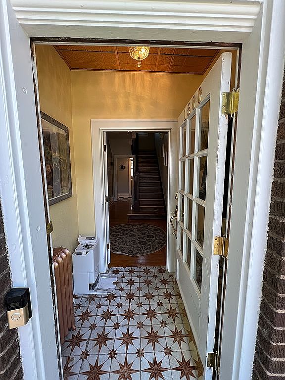 The entryway features a warm and inviting atmosphere highlighted by a unique patterned tile floor showcasing intricate star motifs in earthy tones of red and white. A charming chandelier hangs from a ceiling adorned with textured tin panels, casting a soft glow across the space. To the left, a vintage radiator hints at the home’s historical charm, complemented by a tasteful framed picture on the wall. The opposite side reveals a set of French doors, allowing light to fill the corridor leading towards a staircase. The golden-hued walls enhance the sense of warmth and welcome, creating an inviting first impression.