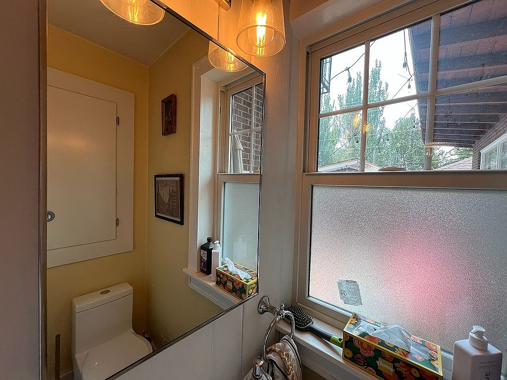 This cozy bathroom features a bright yellow color on the walls, creating a warm atmosphere. A traditional white toilet is positioned against the wall, with a large mirror above a white sink reflecting the room’s light. Natural light filters through a double-hung window, which has frosted glass for privacy. Decorative elements include a framed picture on the wall and a small shelf holding toiletries. A simple, modern light fixture provides illumination. Nearby, a closed door suggests an accessible storage area. Overall, the space is practical yet inviting, showcasing a blend of vintage charm and contemporary functionality.