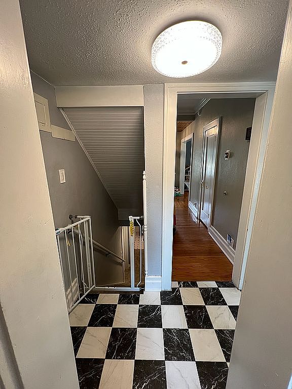 This hallway serves as an entrance to the home, featuring a striking black and white checkered floor that adds a bold visual impact. The walls are painted a soft gray, creating a calming atmosphere, contrasted by the bright, modern ceiling light that offers ample illumination. A set of stairs is visible, leading upward, enclosed by a white baby gate for safety. To the right, a doorway opens into another room, showing glimpses of hardwood flooring and further architectural details. The overall aesthetic blends modern elegance with historic charm, creating an inviting transition space.