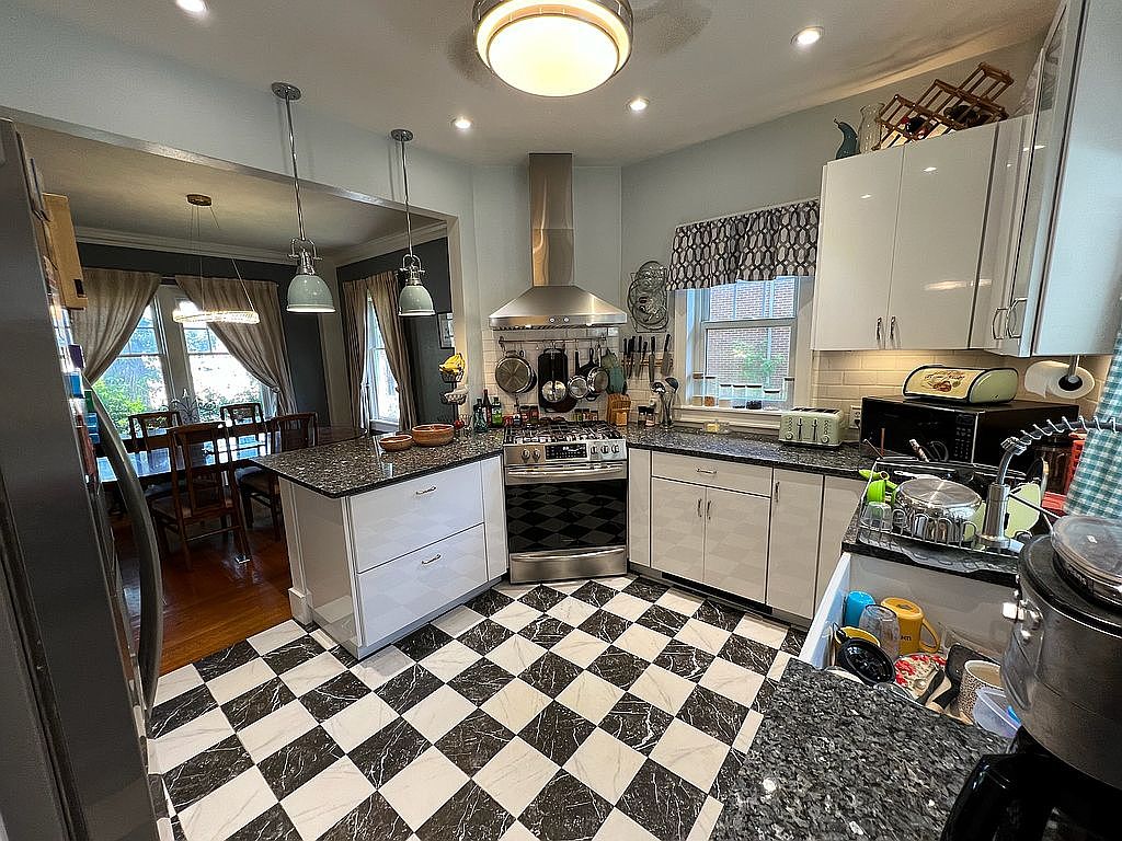 This kitchen blends modern functionality with a touch of classic charm. A striking black and white checkered floor draws attention, enhancing the spacious layout. Sleek white cabinetry contrasts with dark granite countertops, showcasing a well-organized workspace. Stainless steel appliances, including a gas stove and refrigerator, add a contemporary feel. Pendant lights illuminate the counters, while a cozy dining area is visible through large windows framed by elegant drapes. The space exemplifies a harmonious blend of colors and textures, inviting culinary creativity and social gatherings. The layout ensures ease of movement, making it both practical and aesthetically pleasing.