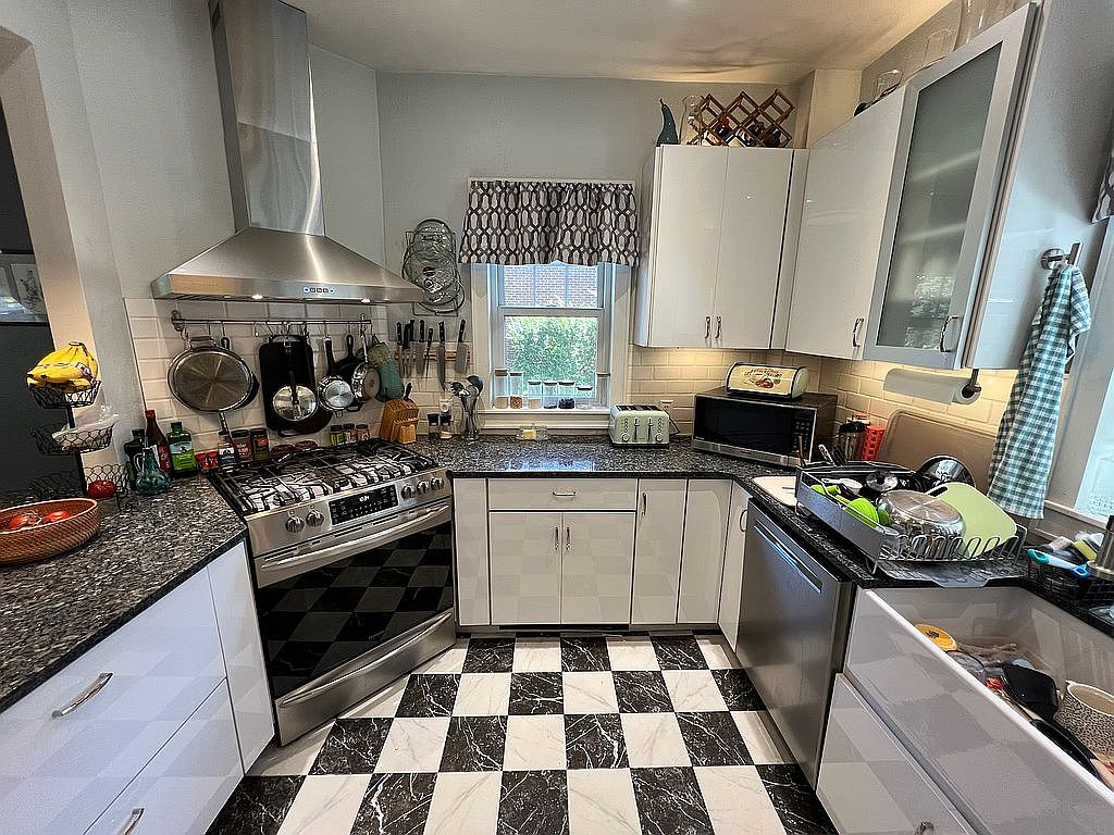 This kitchen features a modern and functional layout with a blend of black and white elements. The striking checkered floor contrasts against sleek white cabinetry and a dark granite countertop. A stainless steel range hood and gas stove serve as focal points, complemented by hanging pots and an array of colorful condiments. Natural light filters through a window adorned with a patterned valance, enhancing the space. Various appliances, including a microwave and a toaster, add practicality, while decorative items, such as a basket of fruits, introduce warmth and vibrancy. The overall aesthetic combines contemporary style with cozy charm.