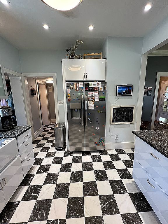 A contemporary kitchen featuring a striking black and white checkered floor enhances its visual appeal. Light blue walls create a fresh ambiance, contrasting with the dark granite countertops. The stainless steel refrigerator, adorned with various magnets and notes, adds a personal touch. A sleek trash can sits discreetly near the fridge, maintaining cleanliness. To the right, a small wall-mounted screen suggests functionality, providing modern convenience. Cabinets in a glossy white finish reflect light, amplifying the sense of space. The layout combines practicality and style, making it an inviting area for culinary activities and family gatherings.