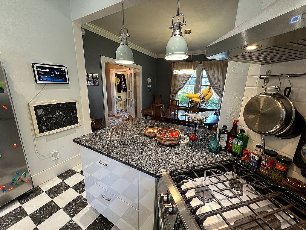 This modern kitchen blends vintage charm with contemporary functionality. A spacious granite countertop serves as the centerpiece, adorned with a woven bowl of fresh fruits. White cabinet drawers complement the sleek stainless steel gas range. The black and white checkered floor adds a stylish contrast. Above, industrial-style pendant lights with aqua shades illuminate the space, while a chalkboard nearby invites creativity or reminders. The open layout connects to a dining area, visible through an archway, featuring light drapes framing a window and a unique banana sculpture in a wire bowl, adding playful character.