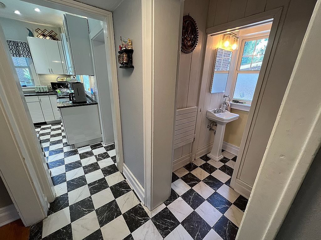 A stylish entryway features a striking black and white checkered floor, creating a bold visual impact. Light streams in from the adjacent window, illuminating the space. The walls are painted a muted gray, offering a modern contrast to the classic flooring. To the right, a compact, elegant powder room showcases a white pedestal sink and a contemporary light fixture. Above the sink, a rectangular mirror enhances the sense of space and light. Decorative elements, like a wooden wall hanging, add character while radiators mounted along the wall provide warmth. This area effortlessly blends modern and traditional aesthetics.