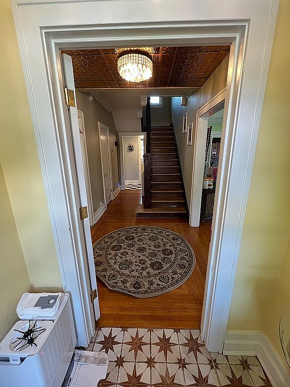 This entryway features a cozy, inviting atmosphere highlighted by warm wooden flooring and a decorative round area rug with intricate patterns. A vintage-style chandelier hangs from the ornate ceiling, casting a soft glow that enhances the ambient feel. Subtle yellow walls complement the natural wood elements, creating a harmonious color scheme. The space is framed by classic white trim that adds a touch of elegance. A staircase leading to the upper level draws the eye upward, flanked by doorways that lead to additional rooms or features. The unique tile pattern near the entrance showcases historic charm.