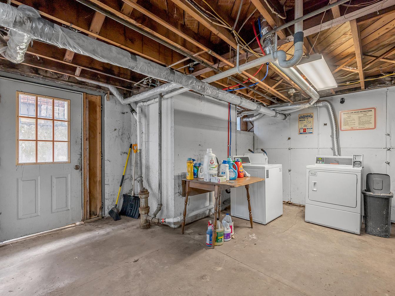 A utilitarian space with exposed wooden ceiling beams and visible ductwork, creating an industrial, unfinished look. The walls are painted white but show aged wear and chipping, contributing to the historic feel. A wooden table holds various laundry detergents, positioned between a top-loading washing machine and a front-loading dryer, both in white. Cleaning supplies are stored on the floor beneath the table. A broom and snow shovel lean against the wall near a weathered door with a windowpane. The concrete floor and fluorescent strip light overhead add to the functional, practical atmosphere of this basement laundry area.
