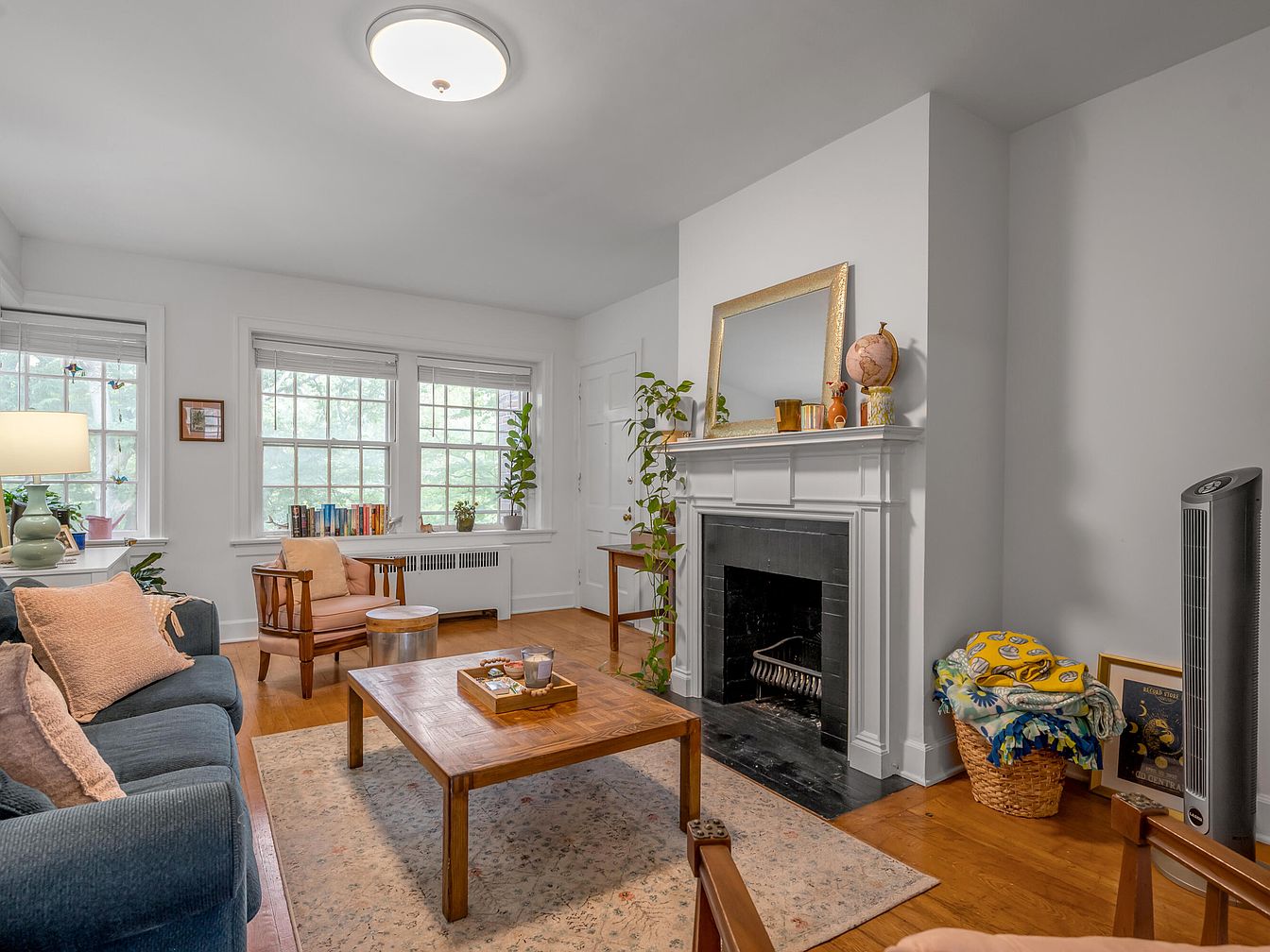 A cozy living room featuring soft blue walls, white trim, and natural wood floors. A white front door sits to the left with a mail slot and beige patterned mat. Adjacent to the door, a pale green upholstered armchair with matching ottoman rests on an ornate multicolored rug. A small decorative side table with books and a tea cup adds charm. The classic fireplace is framed with white molding and topped with a black-and-white portrait, framed photos, and a table lamp. Two wooden chairs and a vintage desk line the far wall, with further rooms visible beyond. Bright natural light filters in, enhancing the warm, historic ambiance.