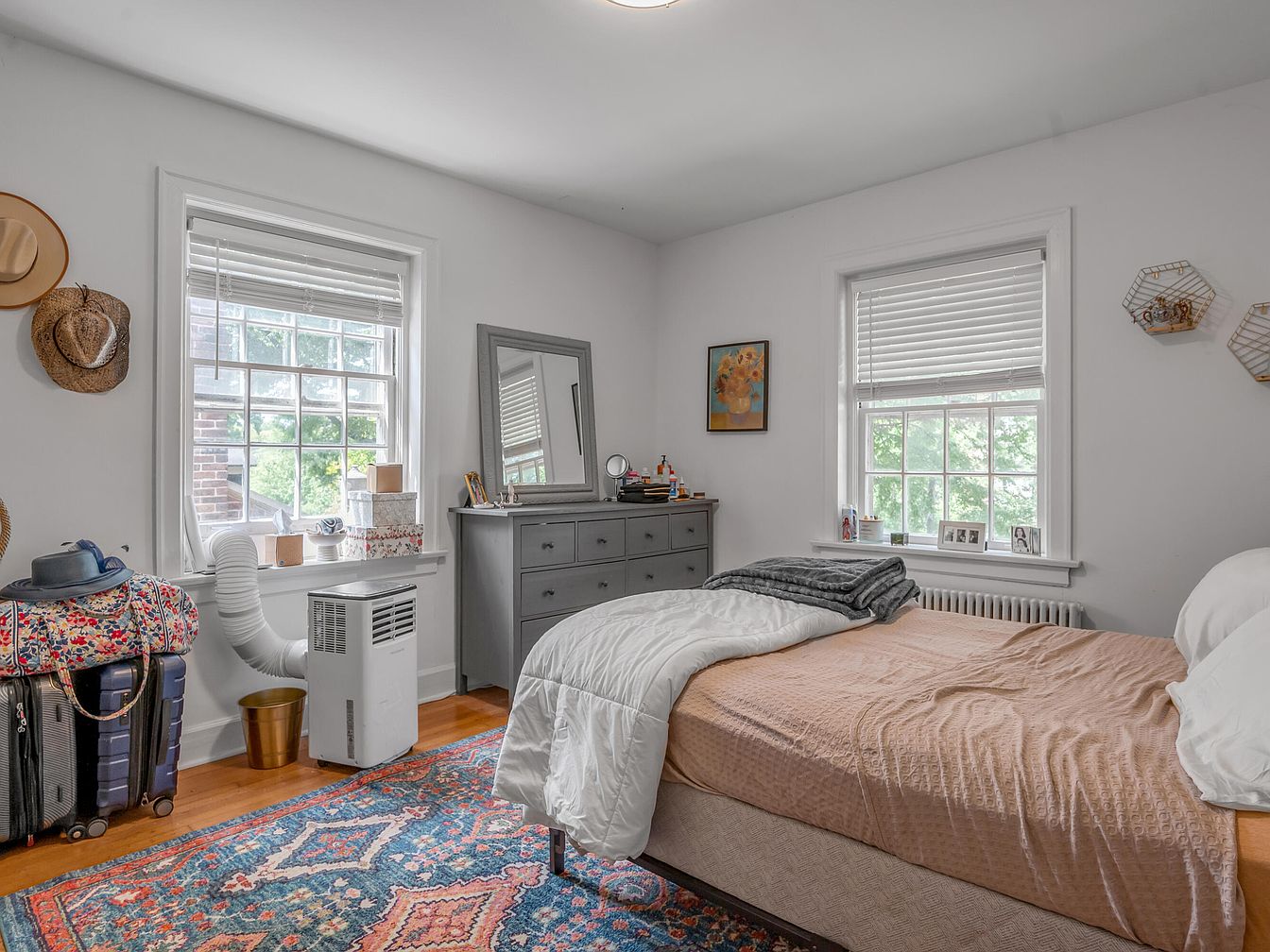 A bright bedroom features two tall windows with white blinds, allowing natural light to fill the space. The walls are painted a soft white, creating a clean, calm backdrop. In one corner, a large gray dresser with a matching mirror provides storage and display for personal items. A bed with pale beige bedding and folded blankets sits atop a richly colored geometric area rug with blue and red accents. Suitcases and a floral-patterned bag are stacked neatly near the window where a portable air conditioner is installed. Hats and decorative shelves adorn the walls, contributing a cozy, personalized touch.