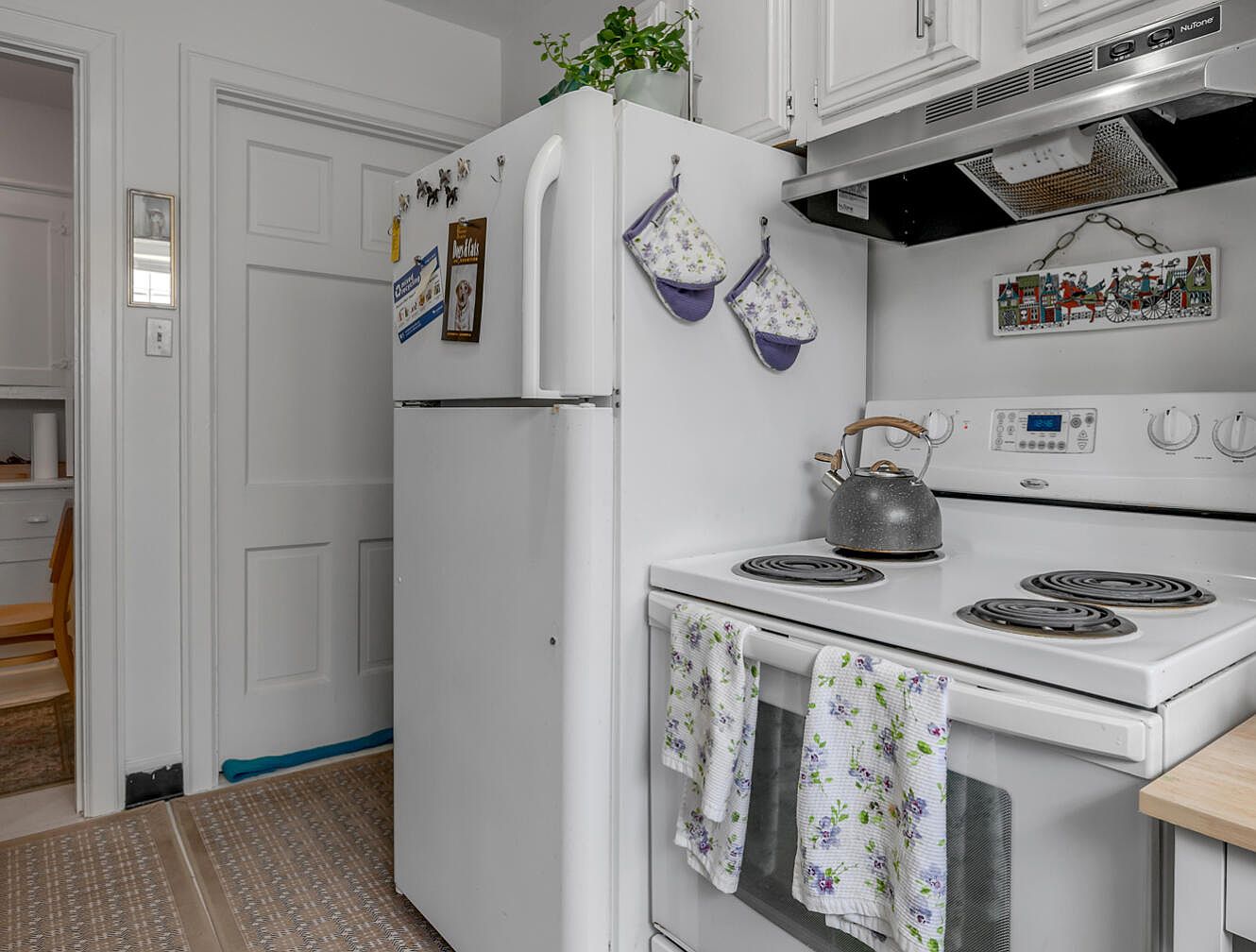 Compact kitchen corner features a white electric stove and oven, paired closely with a white refrigerator. The walls and cabinetry are painted a soft grayish white, giving the space a fresh, bright look. Hard-edged cabinetry is accented with silver hardware and sits above the stove. A silver vent hood and decorative tile add visual interest above the range. Tea towels and oven mitts in matching floral prints and soft lavender tones hang on handles and hooks, adding a cozy, homey touch. The adjacent door is paneled, and a small glimpse of a butler’s pantry or prep area appears through a doorway.
