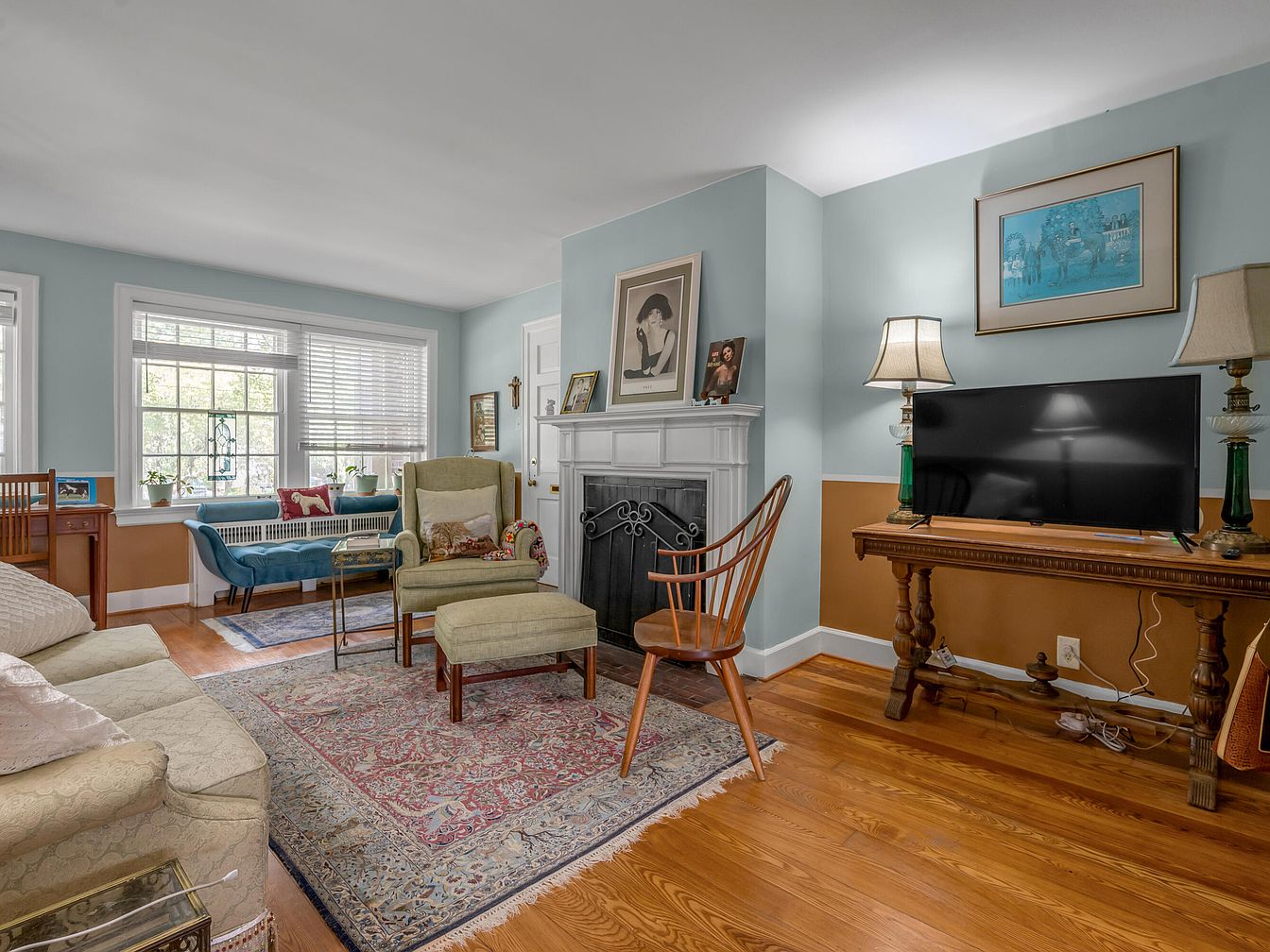 A spacious living room with soft, sky-blue walls and a warm tan accent along the lower part creates a welcoming ambiance. Natural light streams through large multi-paned windows with white blinds over a cozy window seat upholstered in blue fabric. The centerpiece is a white detailed mantel fireplace, adorned with framed photographs and artwork. Traditional furniture, including a patterned sofa, sage green armchair with ottoman, and a wooden chair, provide ample seating. An ornate Persian-style rug sits atop polished hardwood floors. A classic wooden console table holds a television and twin vintage lamps, complementing the room’s elegant yet comfortable aesthetic.