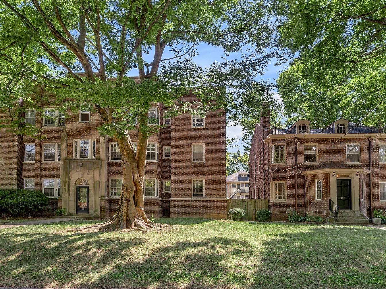 A stately three-story red brick building stands under the shade of two tall, mature trees with dense green foliage, creating dappled light across the lawn and sidewalk. The central entrance features a decorative stone archway, flanked by symmetrical windows typical of early twentieth-century American apartment buildings. Decorative stonework, black iron railings, and well-kept bushes add charm and historical character to the facade. The grass is neatly trimmed, and a small stone wall sits on the left side. Overall, the aesthetics evoke classic American residential architecture with a natural, tranquil street presence.