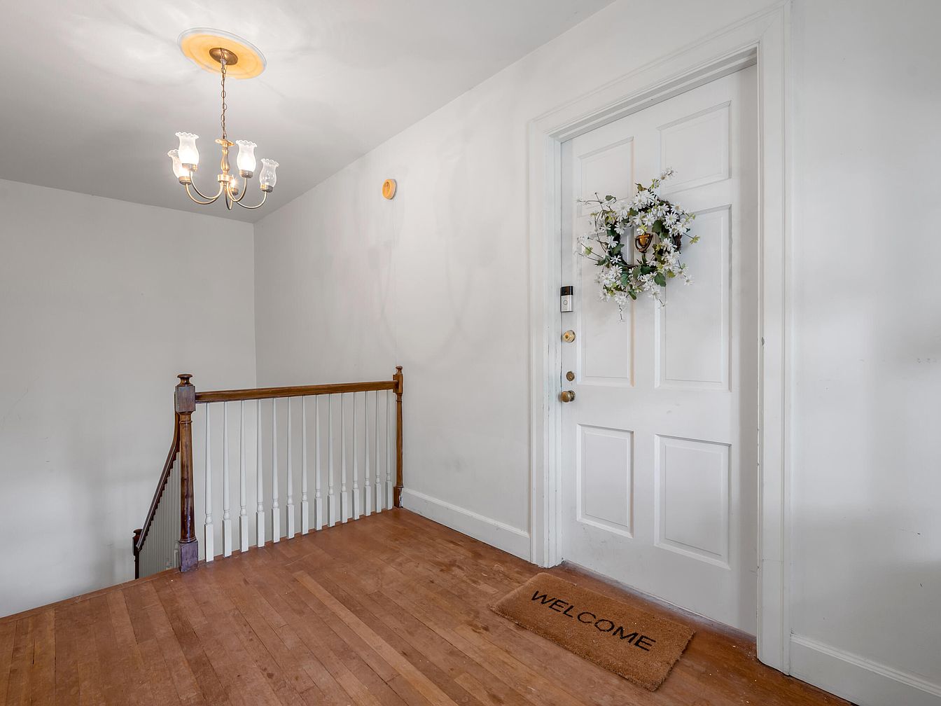 This entryway is located at the top of a staircase and features a simple, welcoming design. The hardwood floor displays a natural worn patina, leading to a white paneled door adorned with a floral wreath and accompanied by a tan welcome mat. The stair railing combines dark wood posts and white spindles for a traditional touch, echoing the historic charm of the home. Above, a brass chandelier with five frosted glass shades provides soft, ambient light. The walls are painted a soft white, maintaining a bright, airy feel and allowing the classic architectural elements to stand out distinctly.