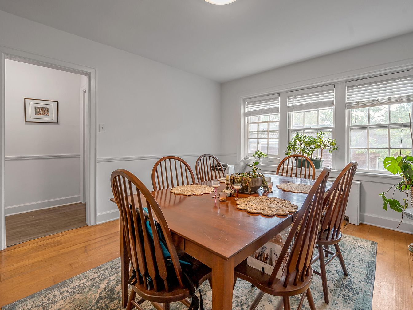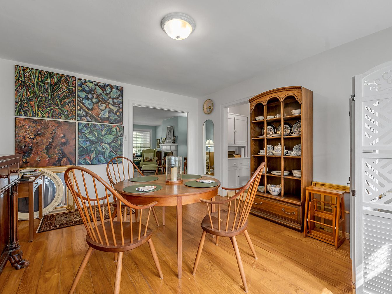 Warm wood tones dominate the dining room, where a round wooden table is paired with spindle-back chairs in a mid-century style. The hardwood floor adds a sense of rustic charm, complementing the large open shelving unit that displays an array of vintage porcelain. On one wall, four large, colorful botanical art pieces provide a vibrant focal point. White walls and trim keep the atmosphere light and airy, while ample natural light streams in from the adjoining living room. A mix of modern and traditional elements blend, with hints of character seen in stacked tables, a folding screen, and architectural molding.
