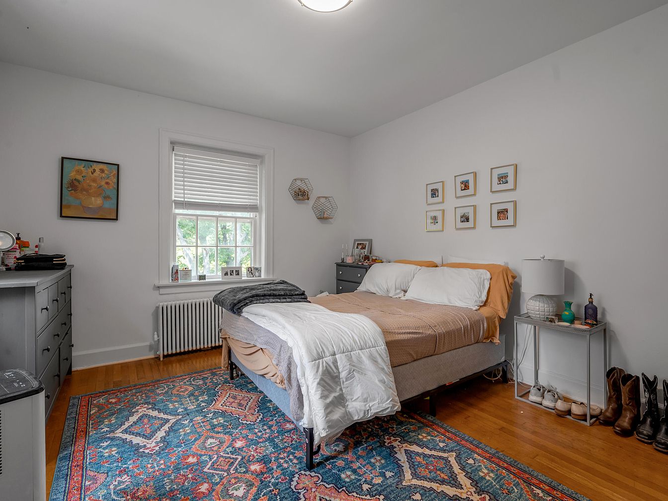 A cozy bedroom centers on a queen-sized bed dressed in neutral bedding with white and orange pillows. The floor features a richly patterned blue and red area rug, providing vibrant contrast to the otherwise simple color palette. The walls are painted a soft white, adorned with a small gallery of framed photographs and art, including a sunflower painting. Window blinds cover a double-hung window, letting in natural light. A gray dresser and a nightstand frame the bed, topped with a lamp and decorative objects. Shoes, boots, and personal items are neatly arranged, creating an organized and inviting atmosphere.