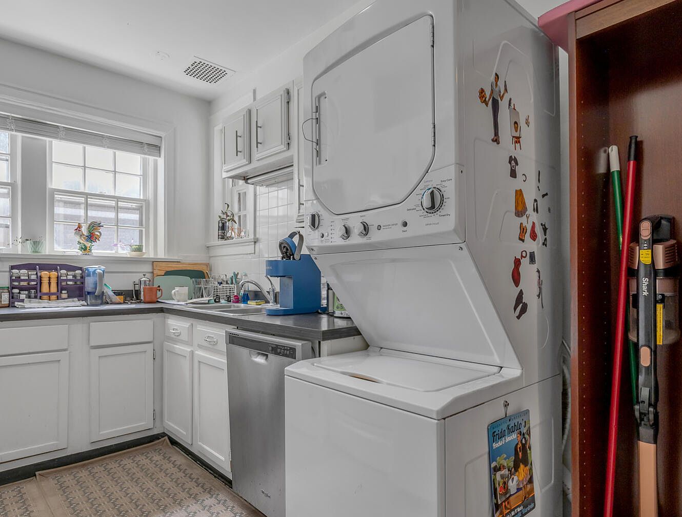 A compact multifunctional corner features white cabinetry with silver handles and a black countertop, merging laundry and kitchen functions. A stacked washer and dryer unit stands beside the dishwasher, decorated with whimsical magnets. Above the stainless steel sink, a large double window allows abundant daylight to brighten the space. The windowsill is adorned with a colorful rooster figurine and small potted plants. A blue coffee machine and organized dish rack sit near a collection of mugs and utensils, while a wooden shelf on the right holds upright brooms and cleaning tools. The palette is overwhelmingly white, with soft touches of bright, cheerful colors.