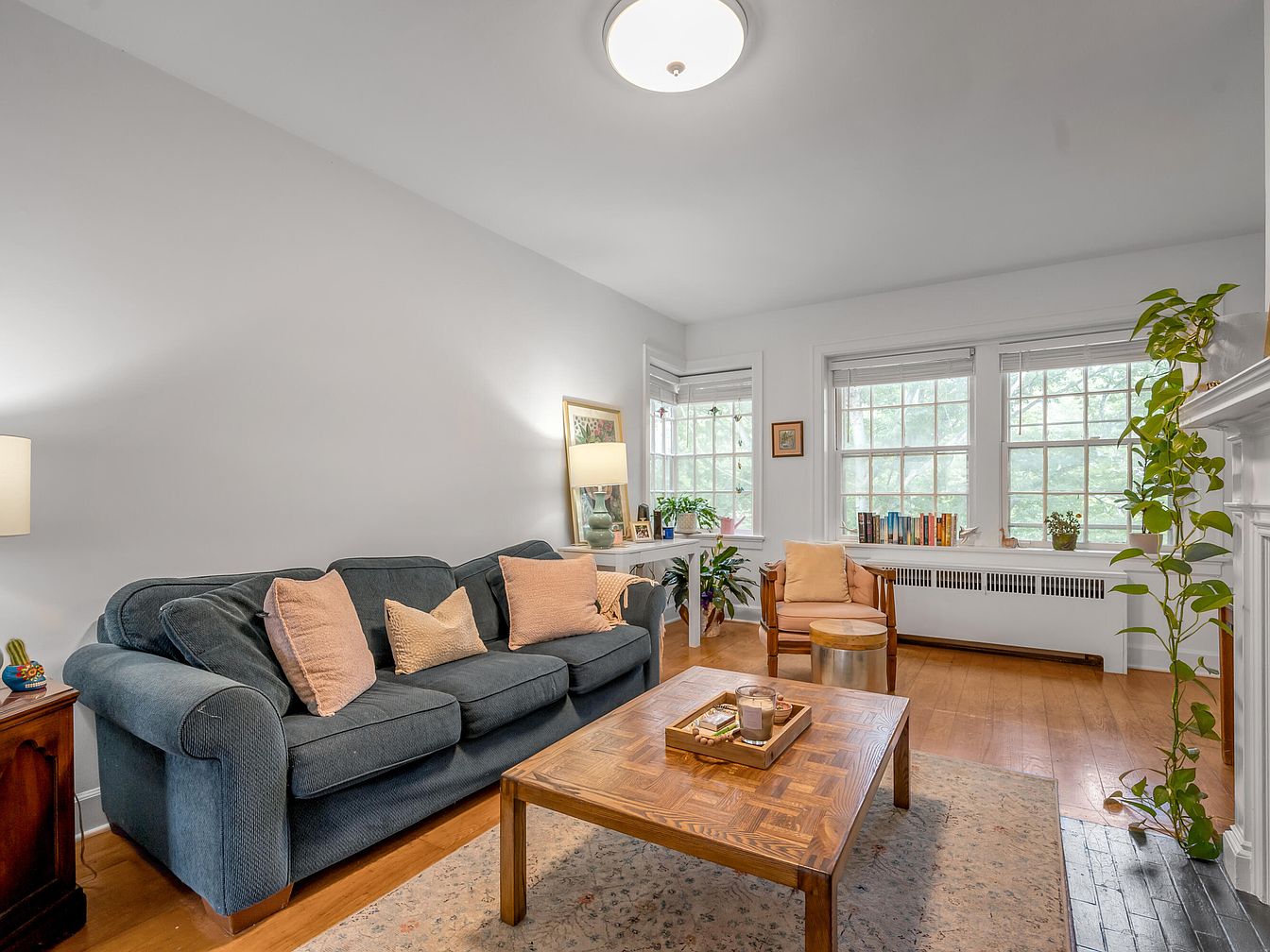 A bright and inviting living room features a deep blue sofa adorned with soft beige accent pillows. The walls are painted a crisp white, enhancing natural light from three large windows with white molding. The warm hardwood floors are partially covered by a subtle patterned rug, grounding a wooden coffee table with a tray and candles. A cozy reading nook with a wooden chair and side table sits near the window. Potted plants add fresh greenery, while a tall trailing plant stands beside a classic white fireplace mantel. Books, framed art, and soft lighting complete the comfortable, homey ambiance.