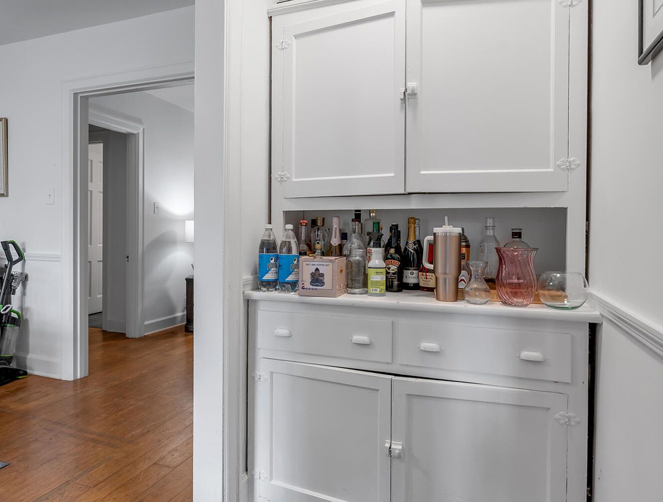 A built-in white wooden cabinet with upper and lower cupboards and two drawers is set into a small alcove within a hallway. The cabinet surface is used as a beverage station, holding various bottles of liquor, sparkling water, and glassware, including a pitcher and tumblers. The surrounding walls are painted crisp white, with a simple chair rail molding for classic detailing. Natural wood floors extend through the hall, creating a warm contrast with the cabinetry. Nearby, doorways open into adjacent rooms, with a soft glow from a lamp faintly illuminating the visible portion of another room. Simple, functional, and subtly charming.