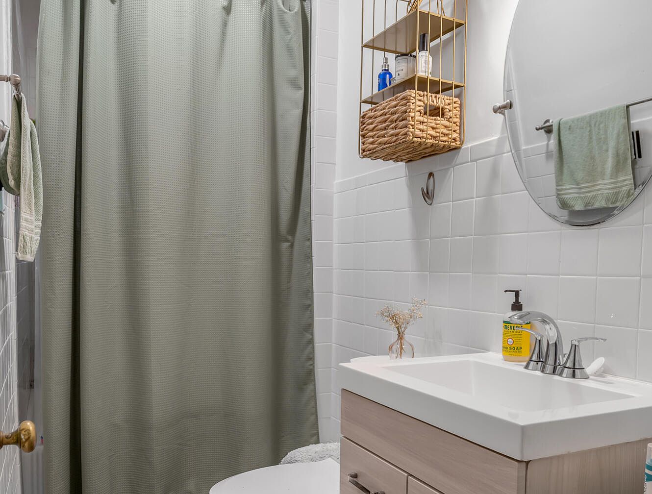 Compact bathroom featuring a modern rectangular sink set into a light wood vanity with chrome fixtures. The wall behind the sink is tiled with glossy white squares, creating a clean and bright ambiance. Above the vanity, there is a round mirror, with a soft green hand towel on a metal bar to the right. A potted dried flower arrangement and liquid soap sit near the faucet. On the left, a light sage-green fabric shower curtain hangs closed, while an open shelf above the vanity holds a woven storage basket and a few small toiletries, adding both functionality and visual warmth.
