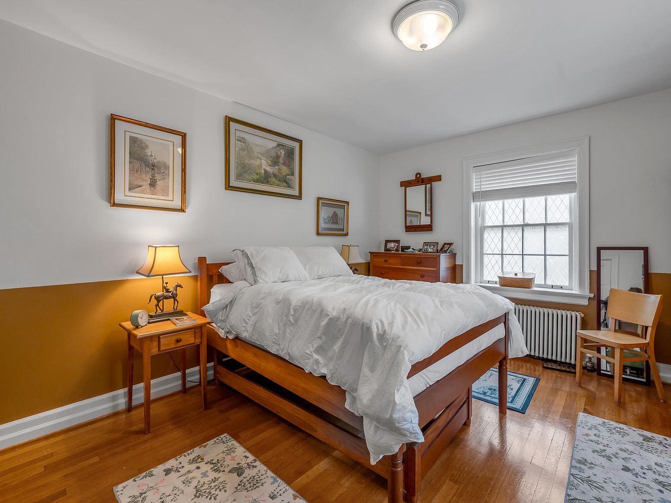 A cozy bedroom with a warm, welcoming atmosphere. The focal point is a wooden bed with crisp white bedding, elevated on matching hardwood floors. Two side tables in a similar finish flank the bed, each topped with a soft lamp, decorative objects, and a small clock. The walls are painted white with a golden ochre accent along the bottom half. Above the bed hang framed landscape artworks, enhancing the traditional charm. A large window with diamond-paned glass and a radiator beneath lets in natural light. The room includes a bedside chair, a wooden dresser with personal photographs, and floral accent rugs for added comfort.