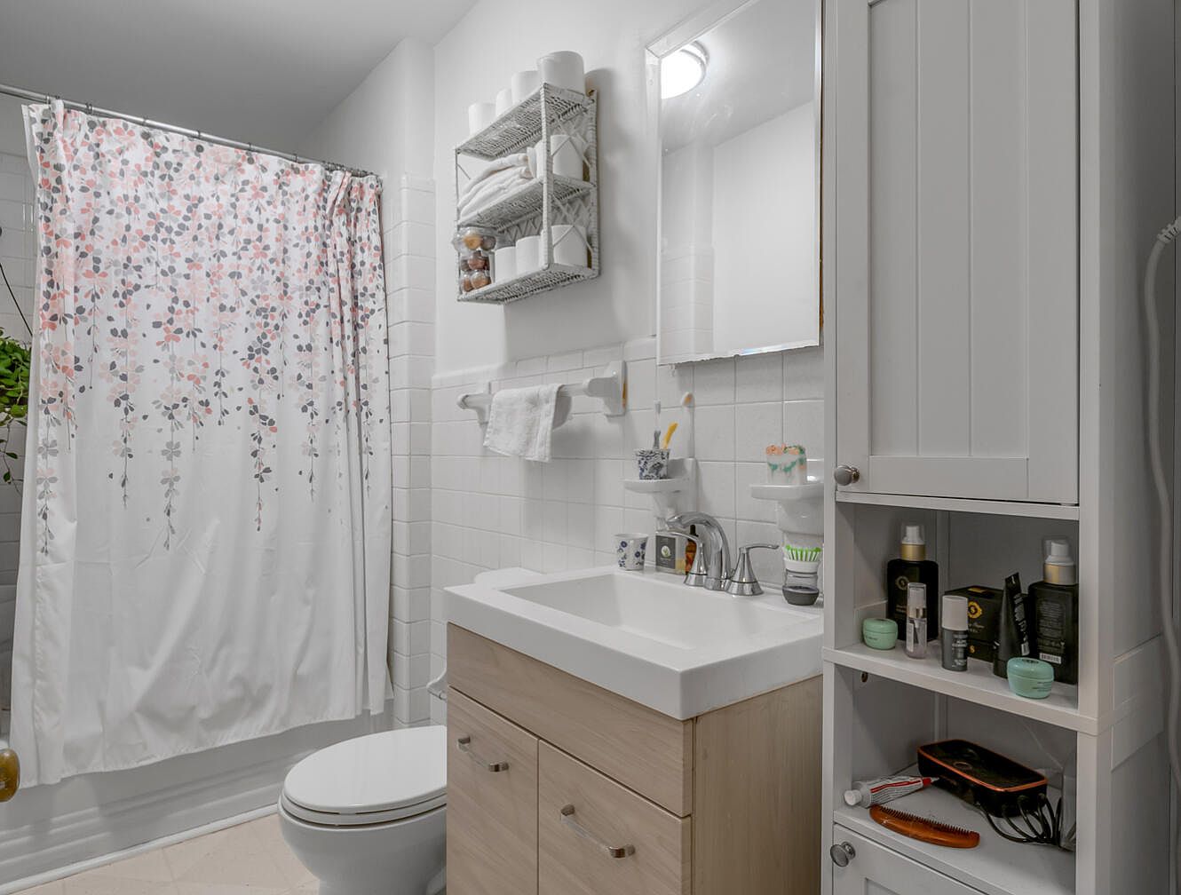 A compact bathroom featuring white tile walls and a soft, neutral color scheme. The vanity is light wood with a white square basin and a modern chrome faucet. Above the sink is a rectangular mirror with a simple frame, while a white cabinet and open shelving unit to the right holds various toiletries and personal care items. A chrome towel rack supports a neatly folded white hand towel. The shower curtain is white with delicate cascading patterns in pink and gray, adding a touch of softness. Overhead lighting is bright, and a small plant adds a touch of greenery for a fresh feel.