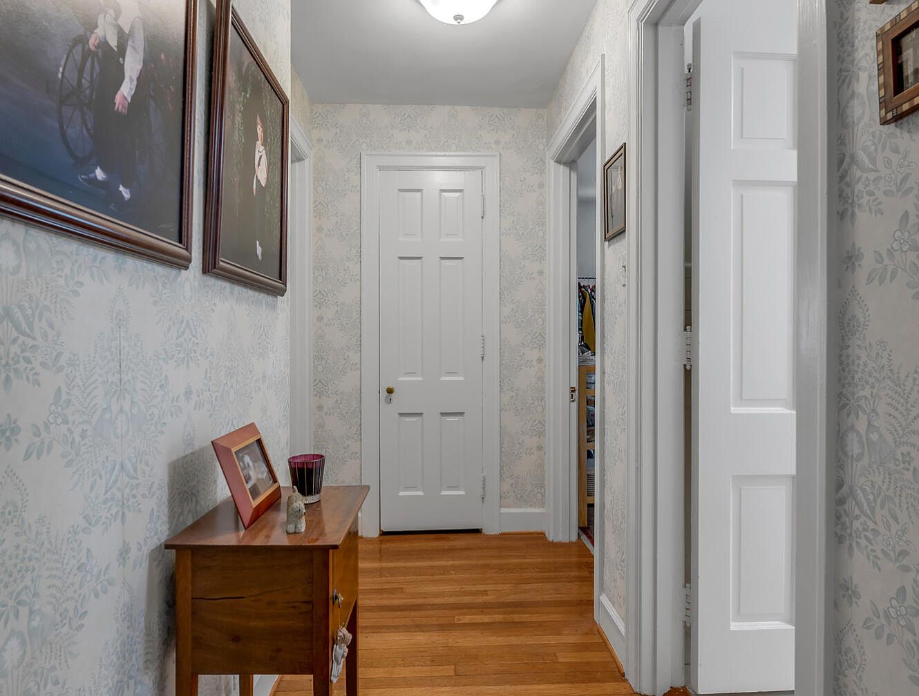 A hallway with light floral-patterned wallpaper and warm, honey-toned hardwood flooring. Three white doors frame the right side and the end of the hall, adding a clean, classic touch. On the left wall, framed family portraits in dark wooden frames hang neatly above a small wooden side table. The table holds a framed photograph, a candleholder, and a decorative stone. The space is softly lit by a ceiling light, highlighting the hallway’s traditional charm and inviting atmosphere, with detail-rich walls providing a vintage feel that complements the simple, timeless furnishings.