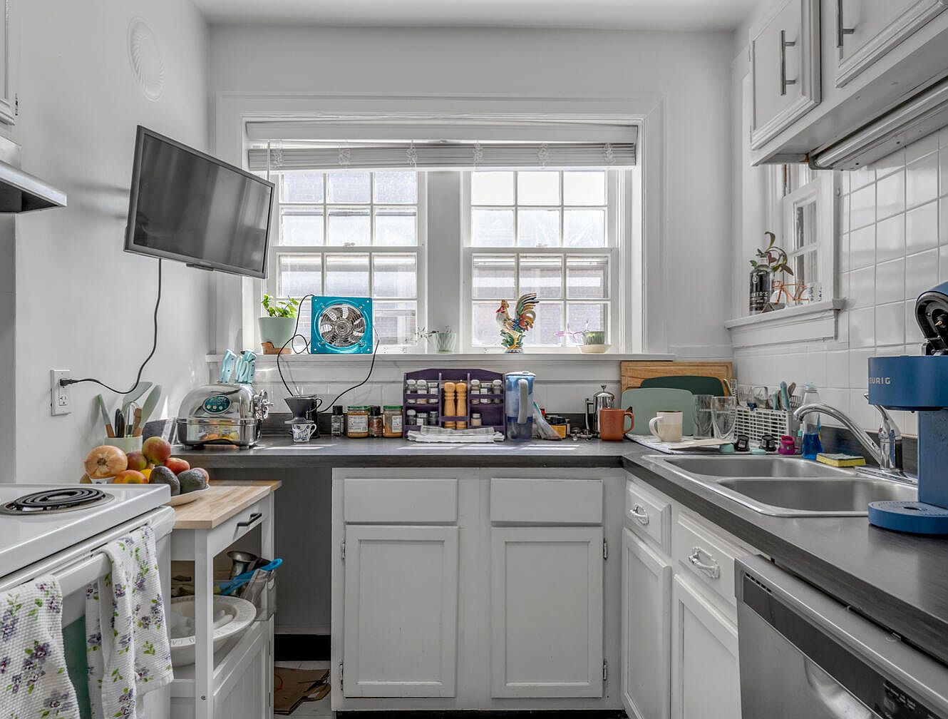 Bright and functional kitchen corner with a double sink set beneath two large, multi-paned windows letting in abundant natural light. Crisp white cabinetry and drawers line the lower and upper areas, paired with sleek dark countertops. In front of the windows, a collection of kitchen gear—cutting boards, a dish rack, and a ceramic rooster decorates the sill. Kitchen appliances, such as a blue coffee maker and toaster oven, are placed for easy access. A small, mobile kitchen island holds a bowl of fruit near a compact stove. The overall palette is airy, dominated by whites and cool neutrals, with colorful, homey accents.