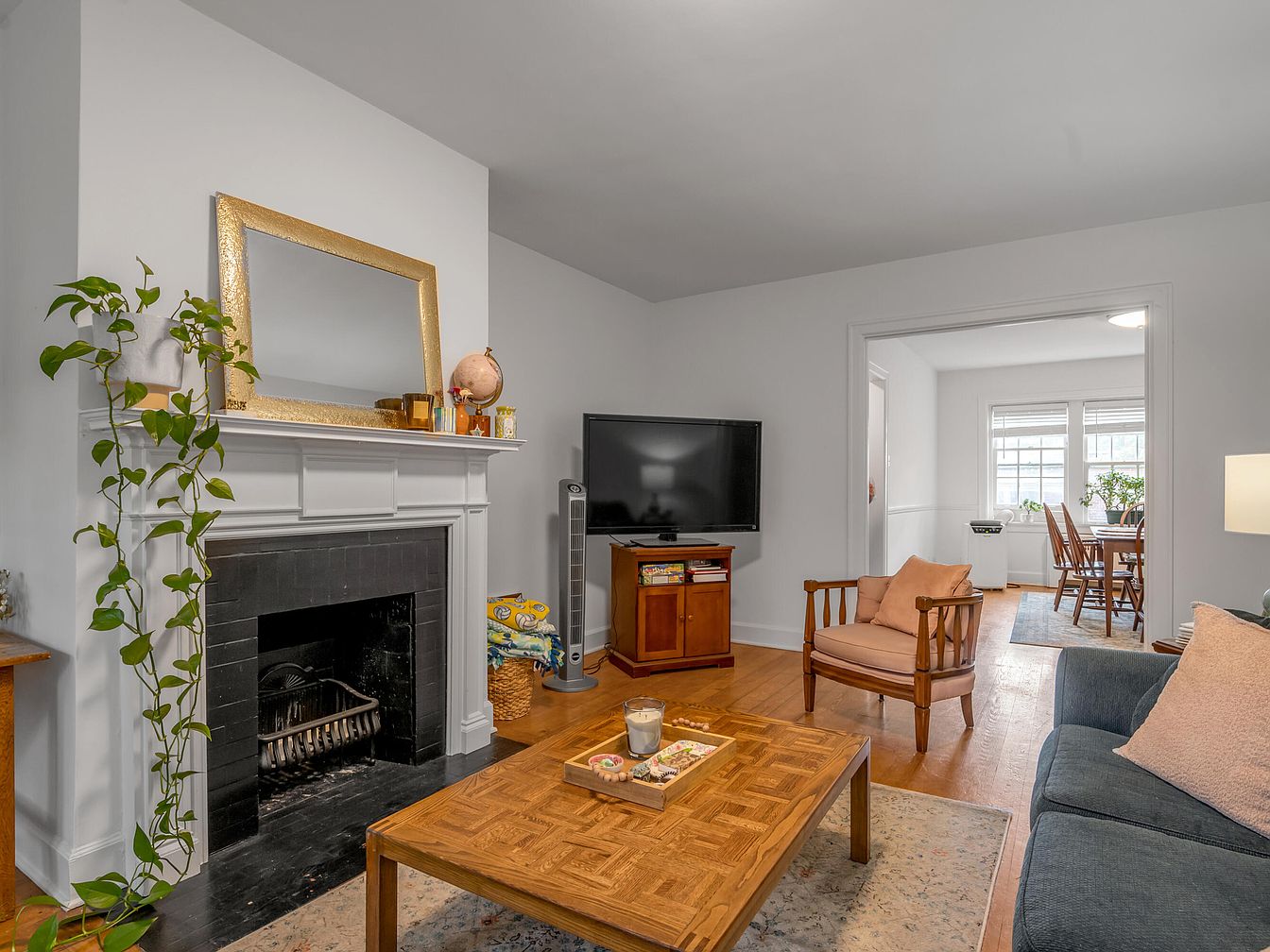 A well-lit living room featuring soft, neutral tones and warm wood accents. The focal point is a classic white mantel fireplace, with a tall green plant and decorative items including a gold-framed mirror, small candles, and a globe. A cozy blue couch with blush pink pillows faces a mid-century styled coffee table and wooden accent chair. A patterned rug softens the hardwood floors, adding texture. To the side, a small cabinet supports a flat-screen TV. Through a wide doorway, the dining area is visible, featuring windows that bring in daylight, and a large table with wooden chairs.