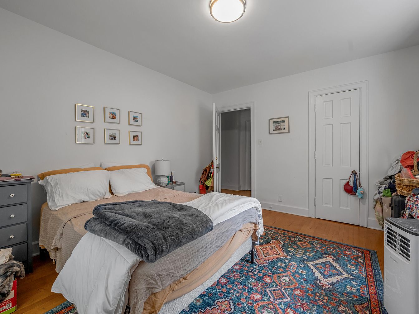 A cozy bedroom features a queen-sized bed with tan bedding, crisp white pillows, and a folded gray plush blanket at the foot. Six small, framed pictures with gold borders are neatly arranged above the bed, adding a touch of personalization to the otherwise minimal space. The walls are painted white, contributing to a bright and airy atmosphere, while the warm wood floor is partially covered by a large, vividly patterned area rug in rich blues and reds. A small gray dresser and bedside table sit along the left wall, and a white door leads to an adjacent room, with another door likely for a closet. Simple decor, natural light, and a touch of informal storage create a lived-in yet welcoming feel.