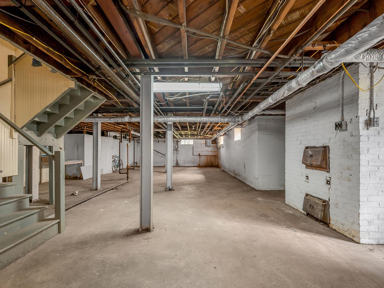 A spacious, unfinished basement with concrete floors and exposed ceiling joists filled with pipes and ductwork, giving it an industrial and utilitarian feel. The space is mostly open, supported by several metal columns and beams. To the left, a painted wooden staircase with muted green steps leads upwards. The brick walls are painted white and include vintage utility access doors and visible conduit wiring. There are small, high windows allowing streaks of natural light into the otherwise dim environment. A few items lean against the wall, and a bicycle is visible in the background, adding to the lived-in, practical atmosphere.