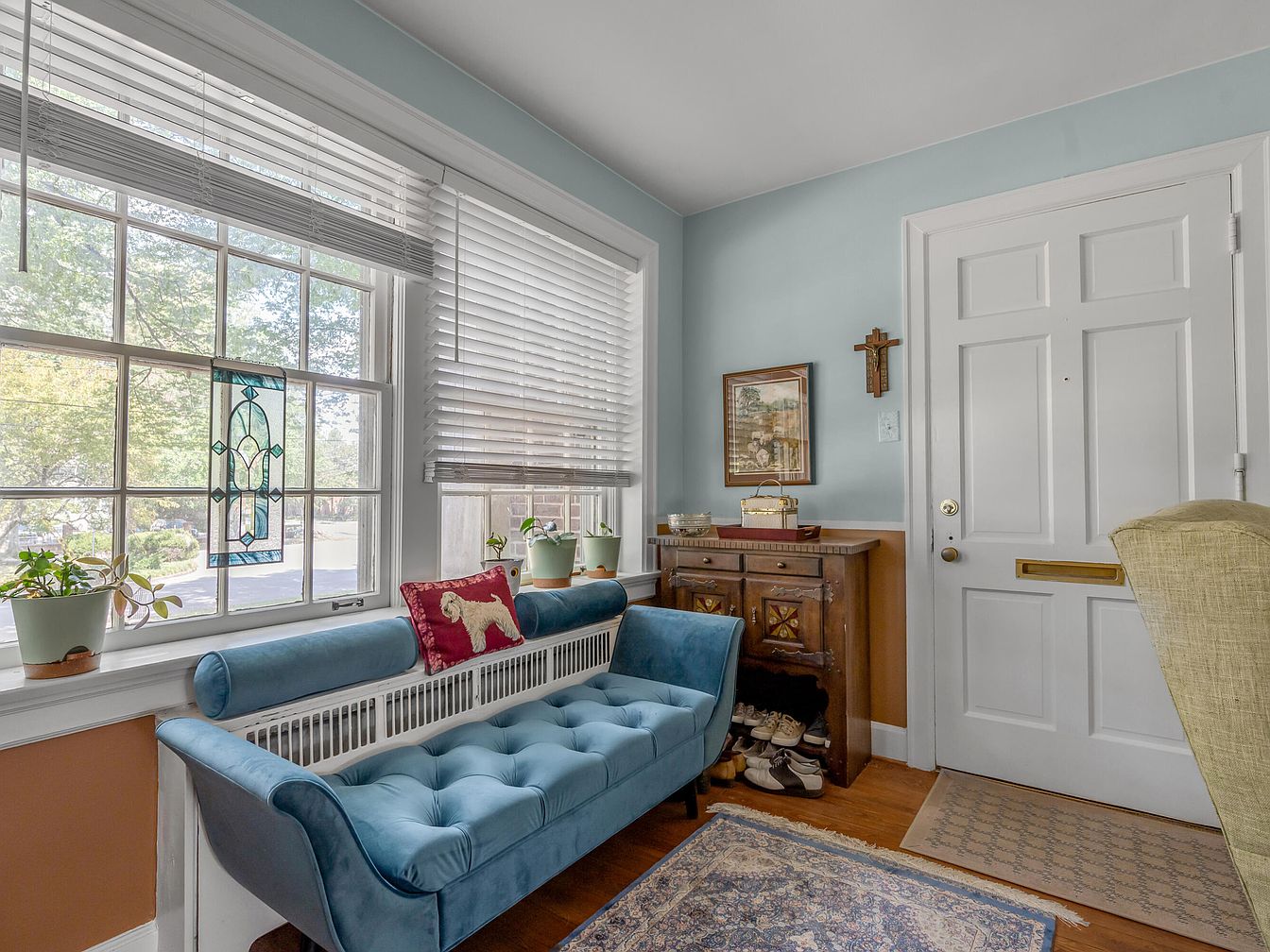 A welcoming foyer area with soft blue walls and abundant natural light from a large divided window. A tufted blue velvet bench sits under the window, adorned with a playful red pillow featuring a dog. Potted plants line the white window sill, adding greenery to the space. Light streams through both standard blinds and a decorative stained glass panel. The entry door is white with a brass mail slot, and beside it hangs a wooden cross and a small framed picture. An antique wooden cabinet holds various trinkets, with neatly arranged shoes beneath, sitting atop a richly patterned rug for warmth and charm.