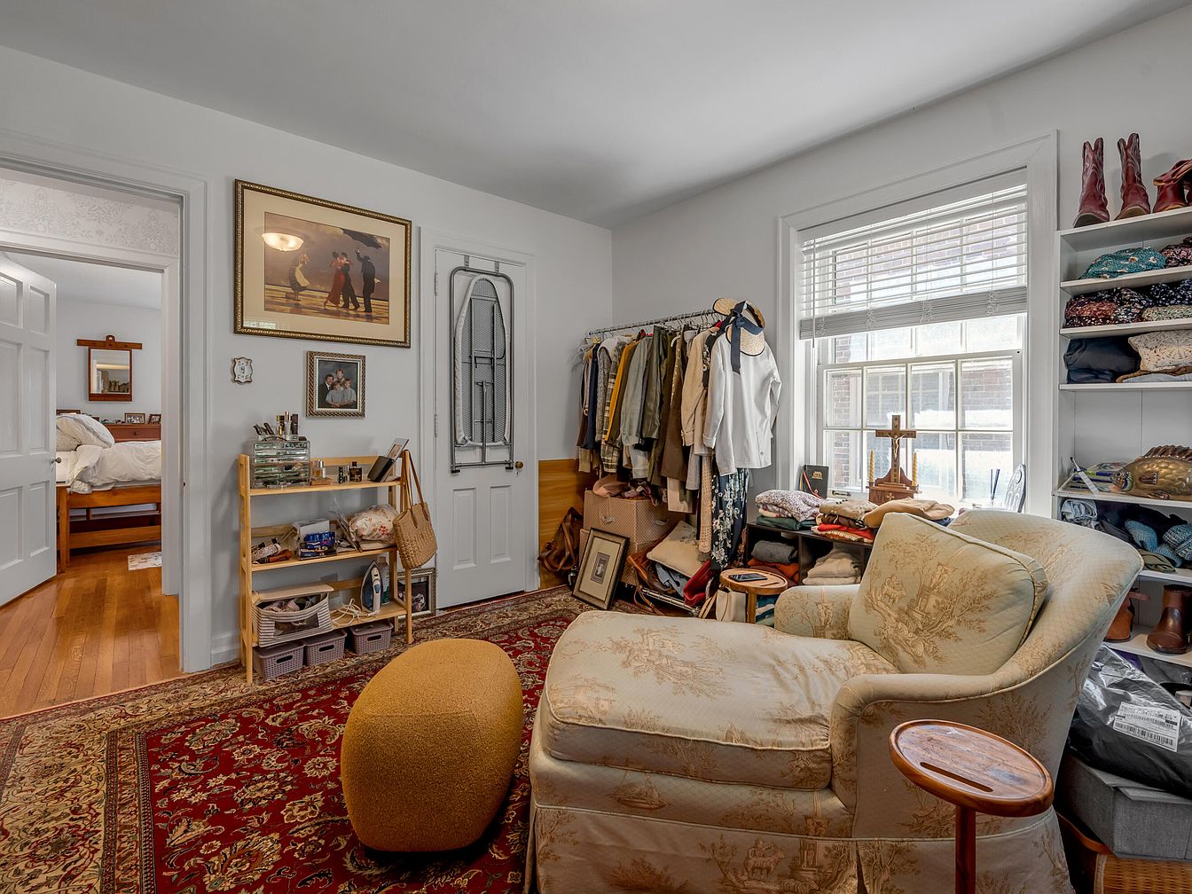 A cozy corner of the home featuring a dressing area with an eclectic, lived-in feel. The space is anchored by a deep red oriental rug with intricate gold and blue patterns covering hardwood floors. An upholstered cream chaise lounge with delicate floral motifs offers a comfortable spot beside a window streaming in daylight. Clothes are arranged neatly on an open rack, while shelves to the right hold folded sweaters, boots, and decorative accents. Wall art, including framed paintings and photographs, gives the room a personal, vintage touch. Soft, neutral wall colors and wooden accents lend warmth and a sense of comfort.