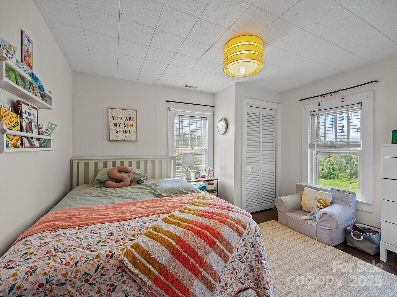 A cozy bedroom features a large bed with soft gray bedding and a matching set of pillows, centered between two windows. The space is illuminated by two table lamps placed on sleek, light-gray nightstands with black hardware. The walls are painted a warm beige, paired with white trim around the windows and baseboards. Wooden blinds enhance the historic character, and the natural light complements the warm-toned hardwood floor. The ceiling has a white grid pattern, accented by a modern flush-mounted ceiling light fixture. The overall feel is simple, clean, and inviting, blending comfort with classic charm.