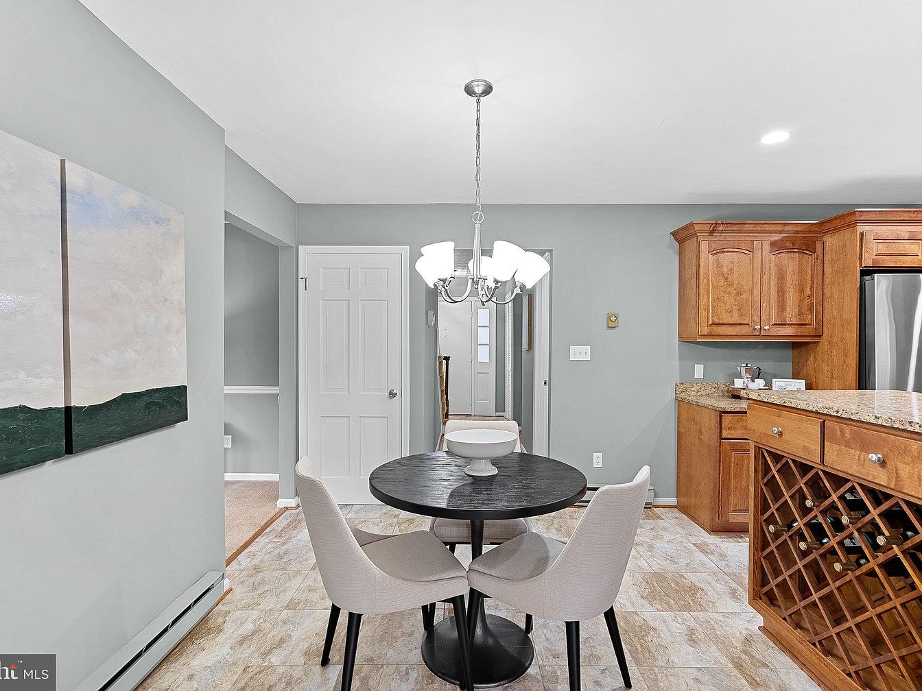 The dining area presents a cozy yet modern ambiance, characterized by a soft, muted gray wall color that enhances natural light. A round black table pairs with sleek, upholstered chairs, creating an inviting dining setup. Above, a stylish chandelier adds a touch of elegance, complemented by a contemporary painting with soft color tones. To the side, warm wooden cabinetry features a wine rack, adding functionality and a rustic charm. The light-colored tile flooring harmonizes beautifully with the overall color palette, making the space feel both spacious and integrated, while walls seamlessly transition into adjoining areas.